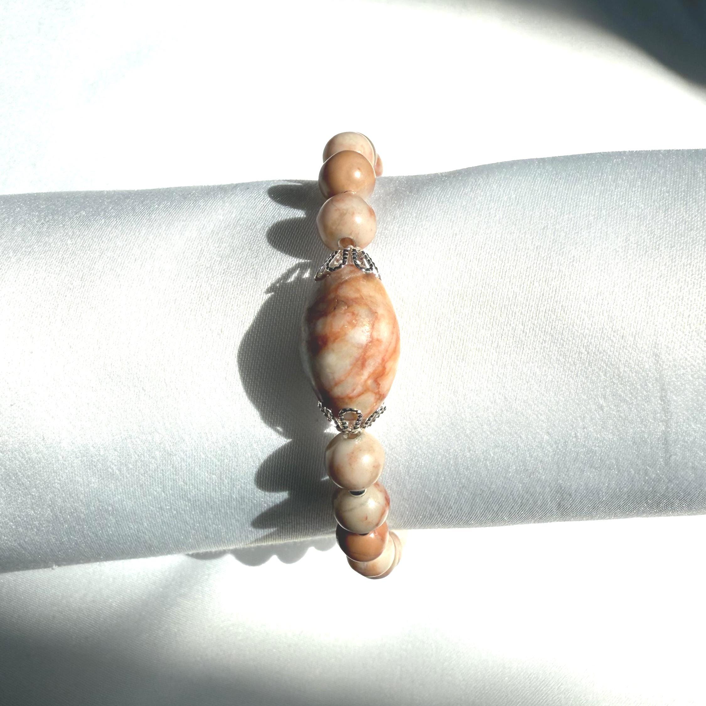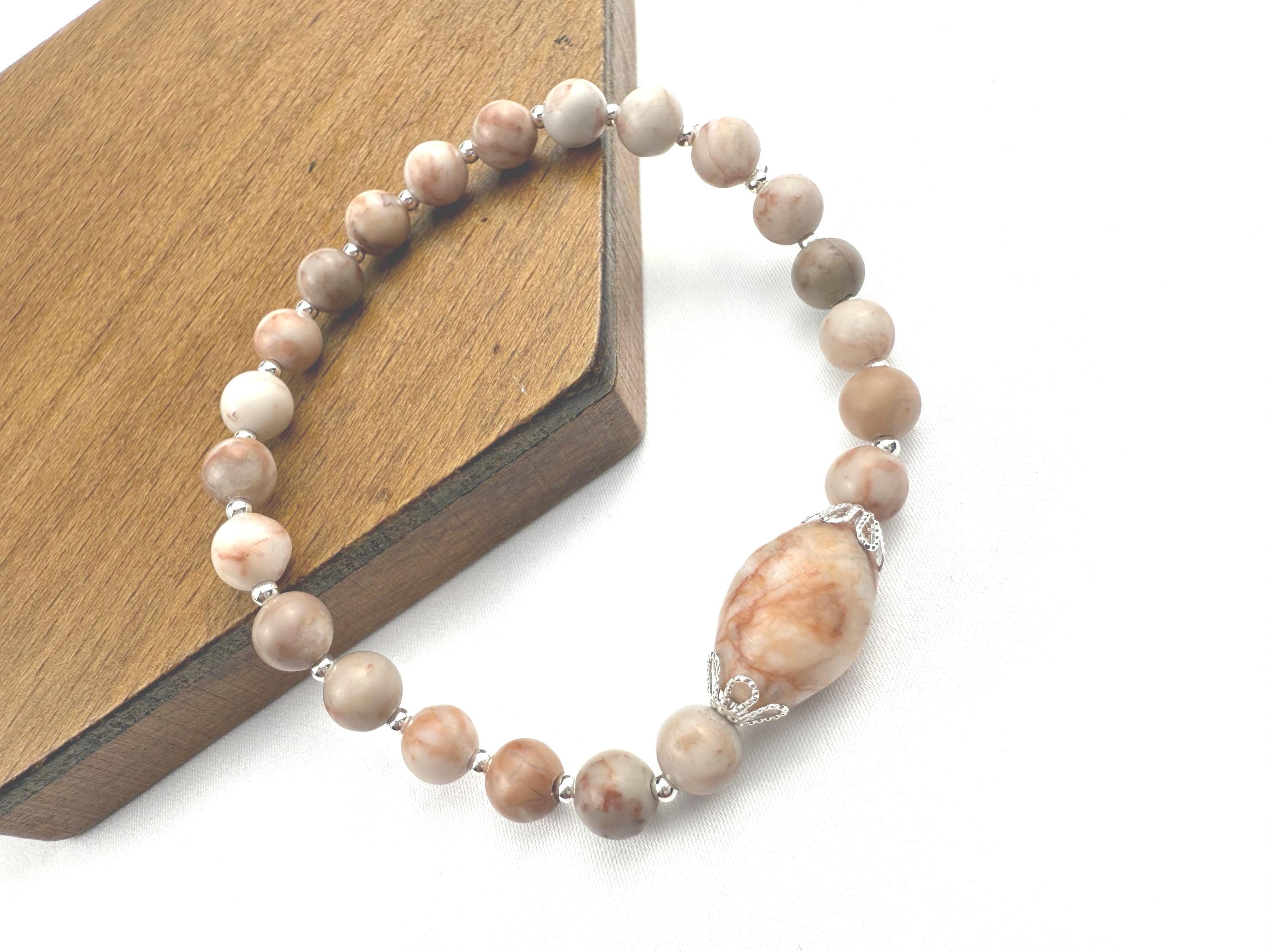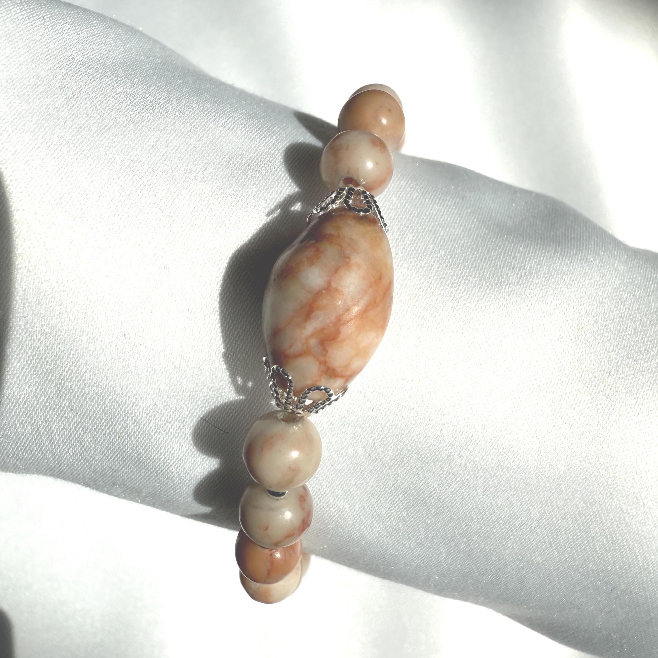Red Spot Marble & Hematite Stretch Bracelet — handcrafted bracelet featuring natural Red Spot Marble beads, hematite accents, and silver plated bead caps on a durable stretch cord. Lightweight, adjustable, and gift-ready, perfect for everyday wear, stacking, or mindful moments.
