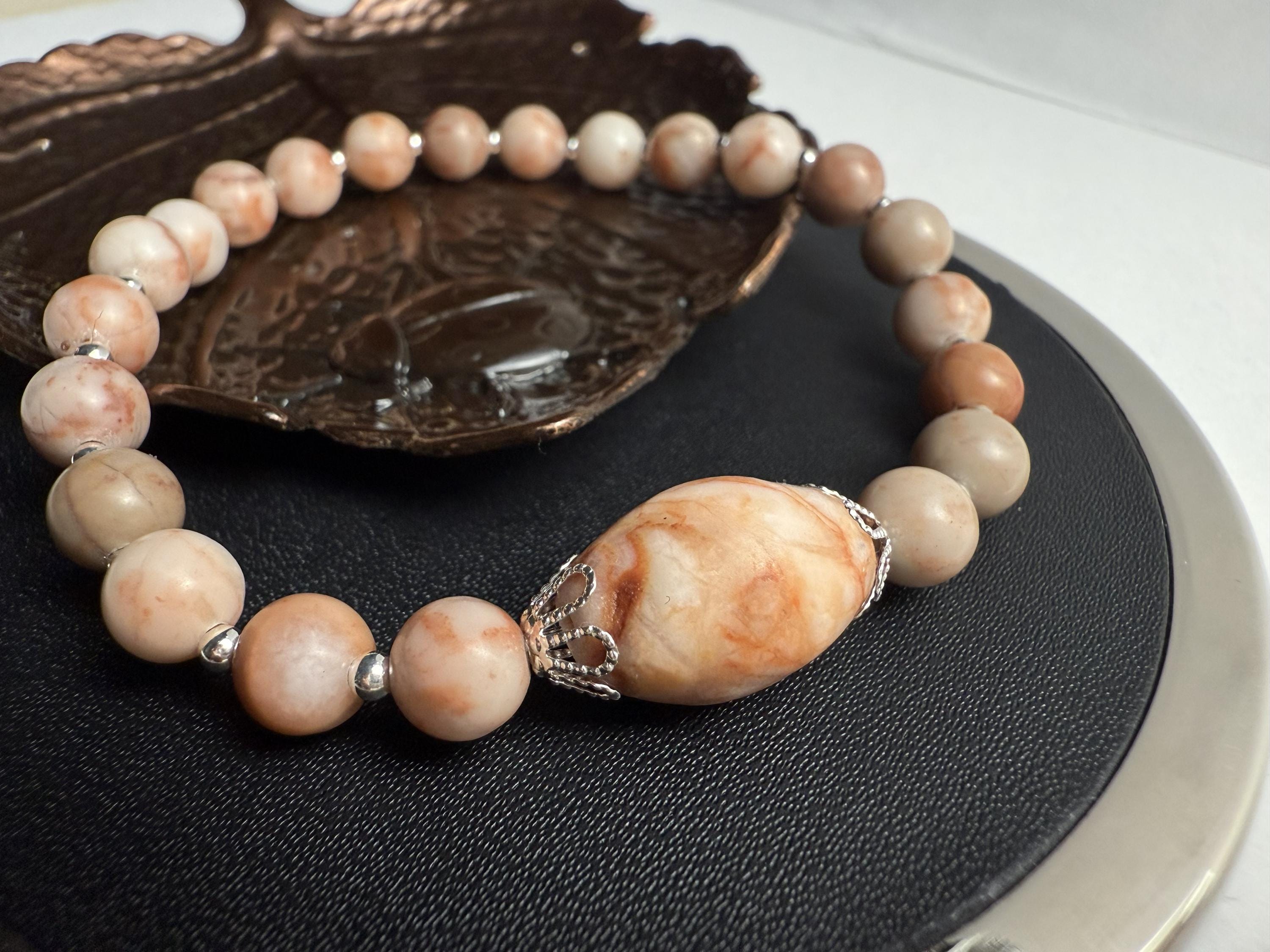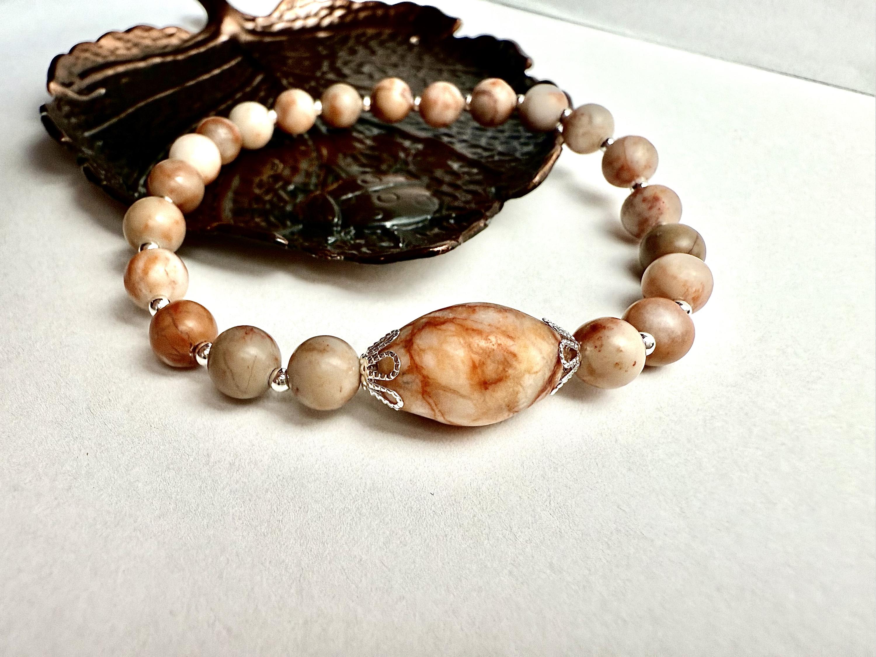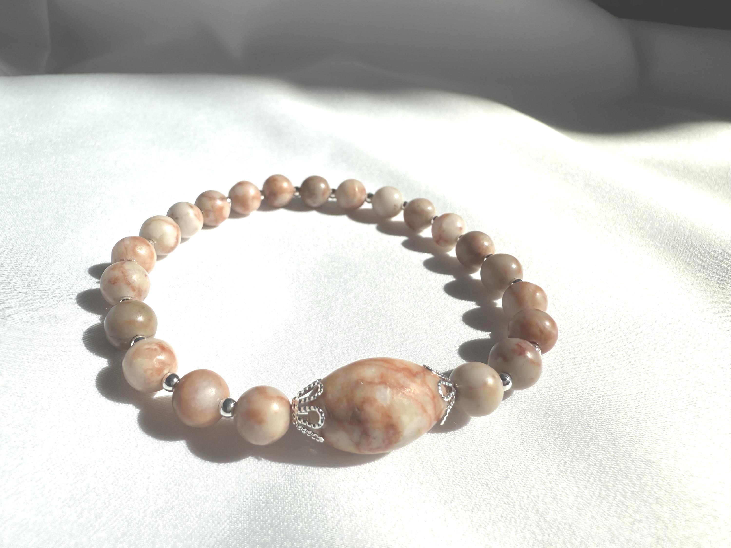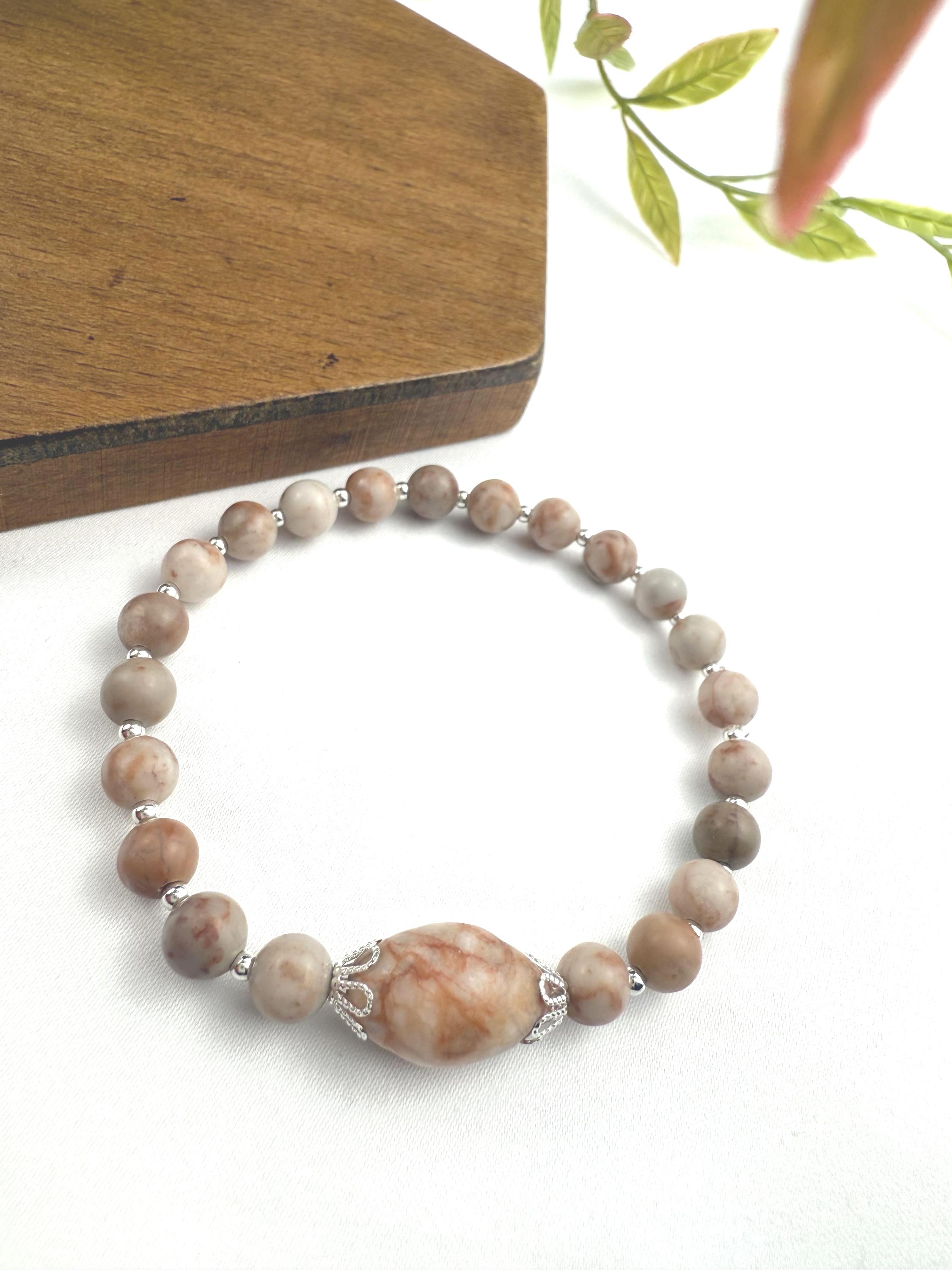 Red Spot Marble & Hematite Stretch Bracelet — handcrafted bracelet featuring natural Red Spot Marble beads, hematite accents, and silver plated bead caps on a durable stretch cord. Lightweight, adjustable, and gift-ready, perfect for everyday wear, stacking, or mindful moments.