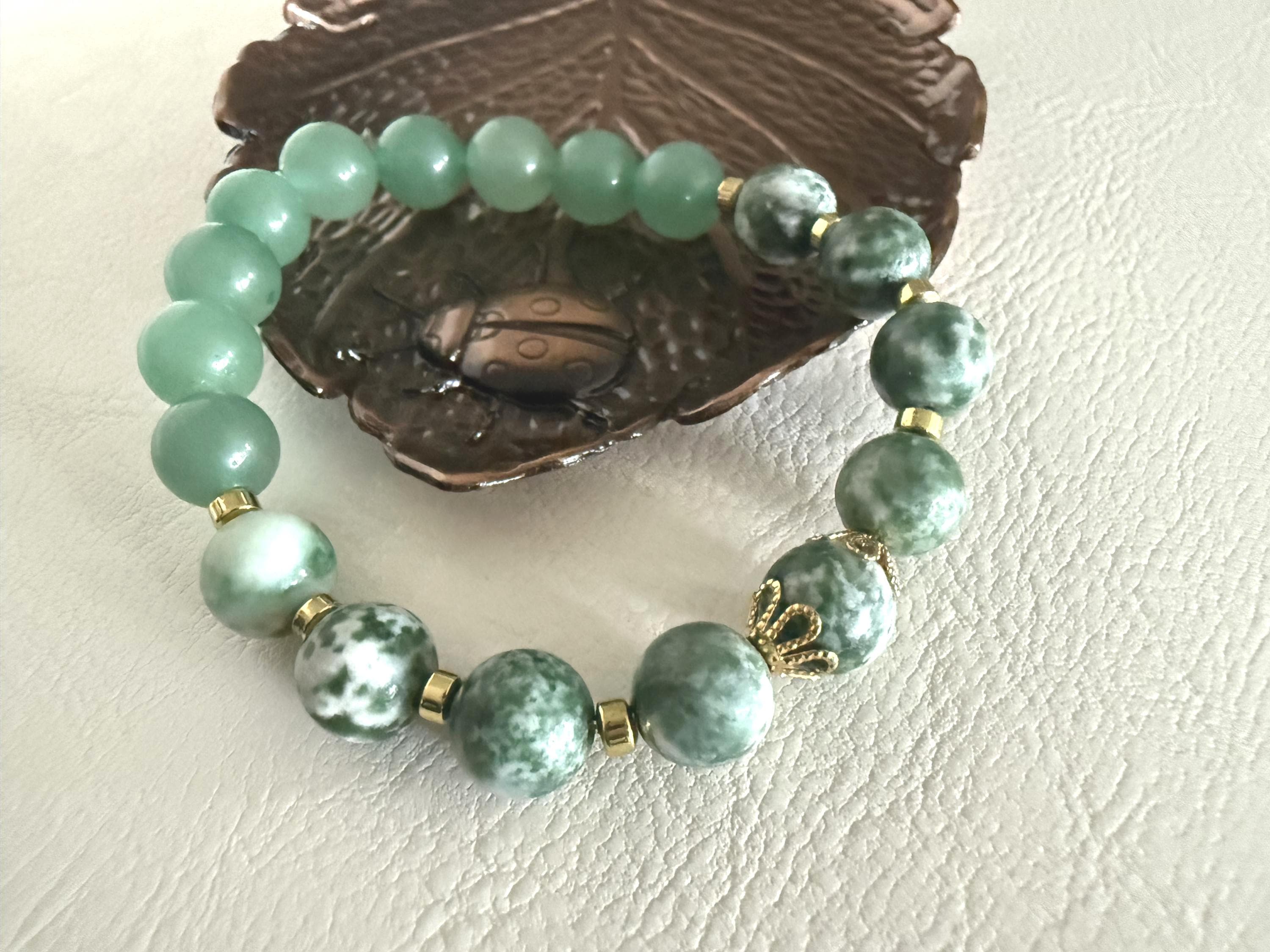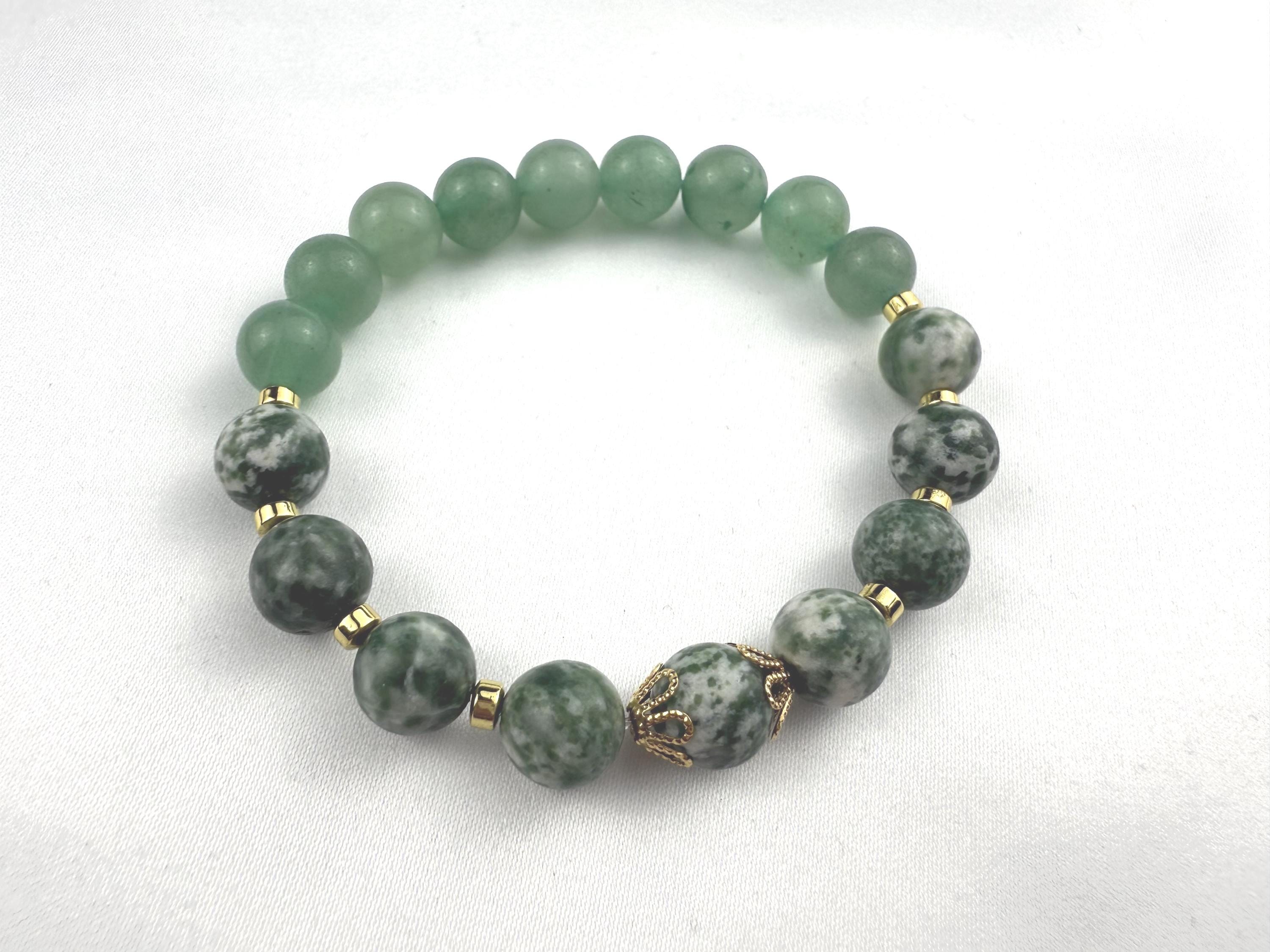 Tree Agate & Green Aventurine Stretch Bracelet — handcrafted bracelet featuring natural Tree Agate, Green Aventurine, and Hematite beads with gold-plated accents on a durable stretch cord. Lightweight, elegant, and gift-ready, perfect for everyday wear, stacking, or mindful/spiritual moments.
