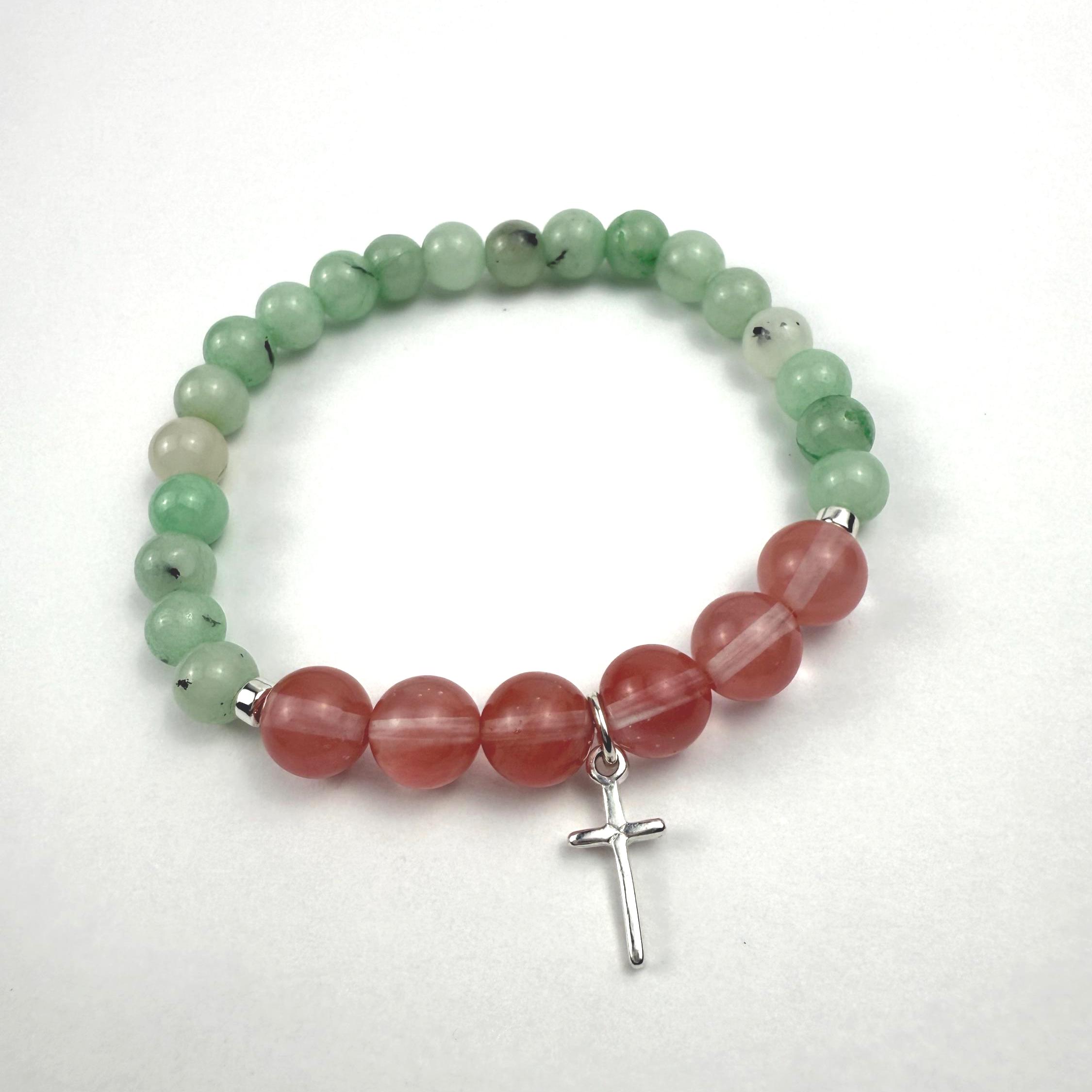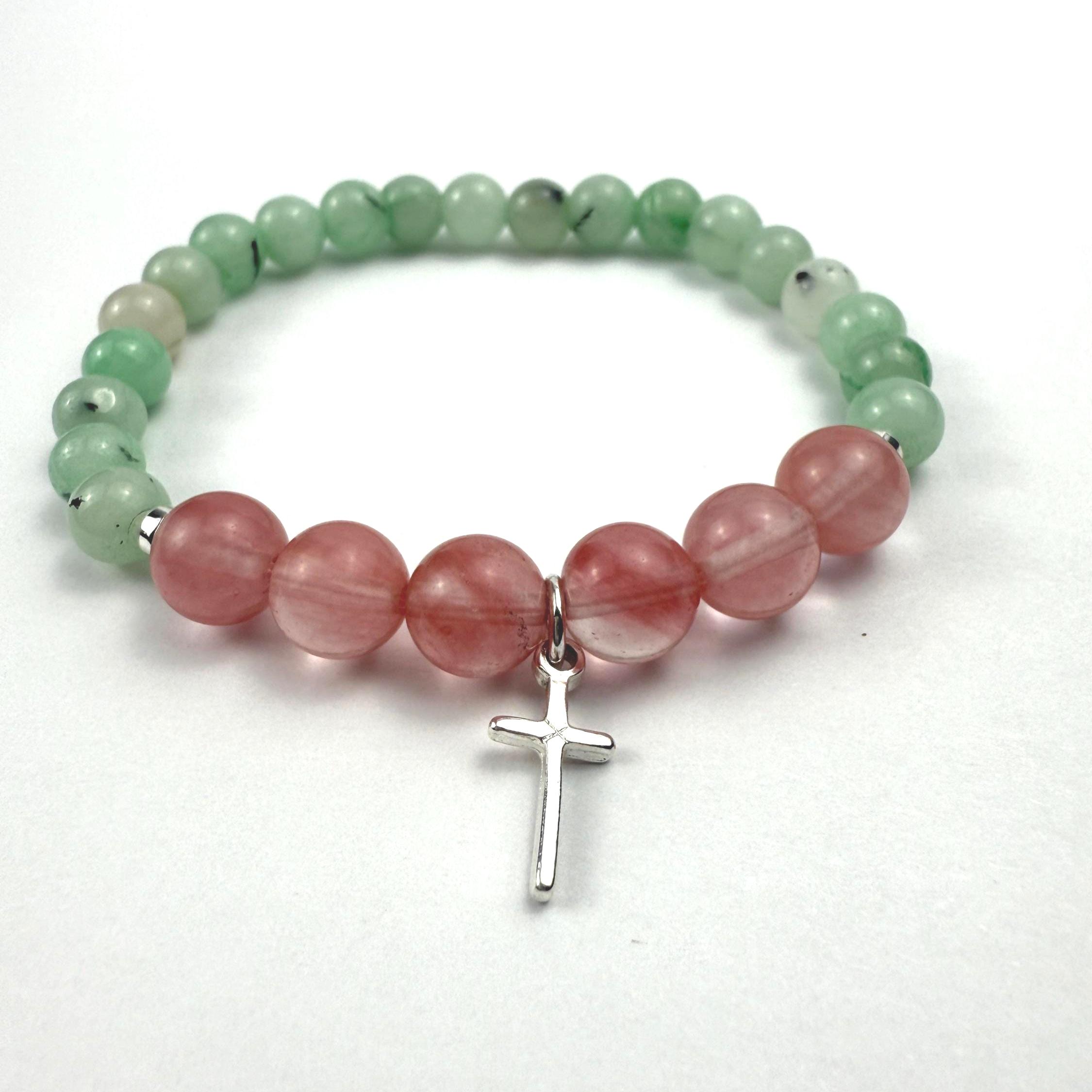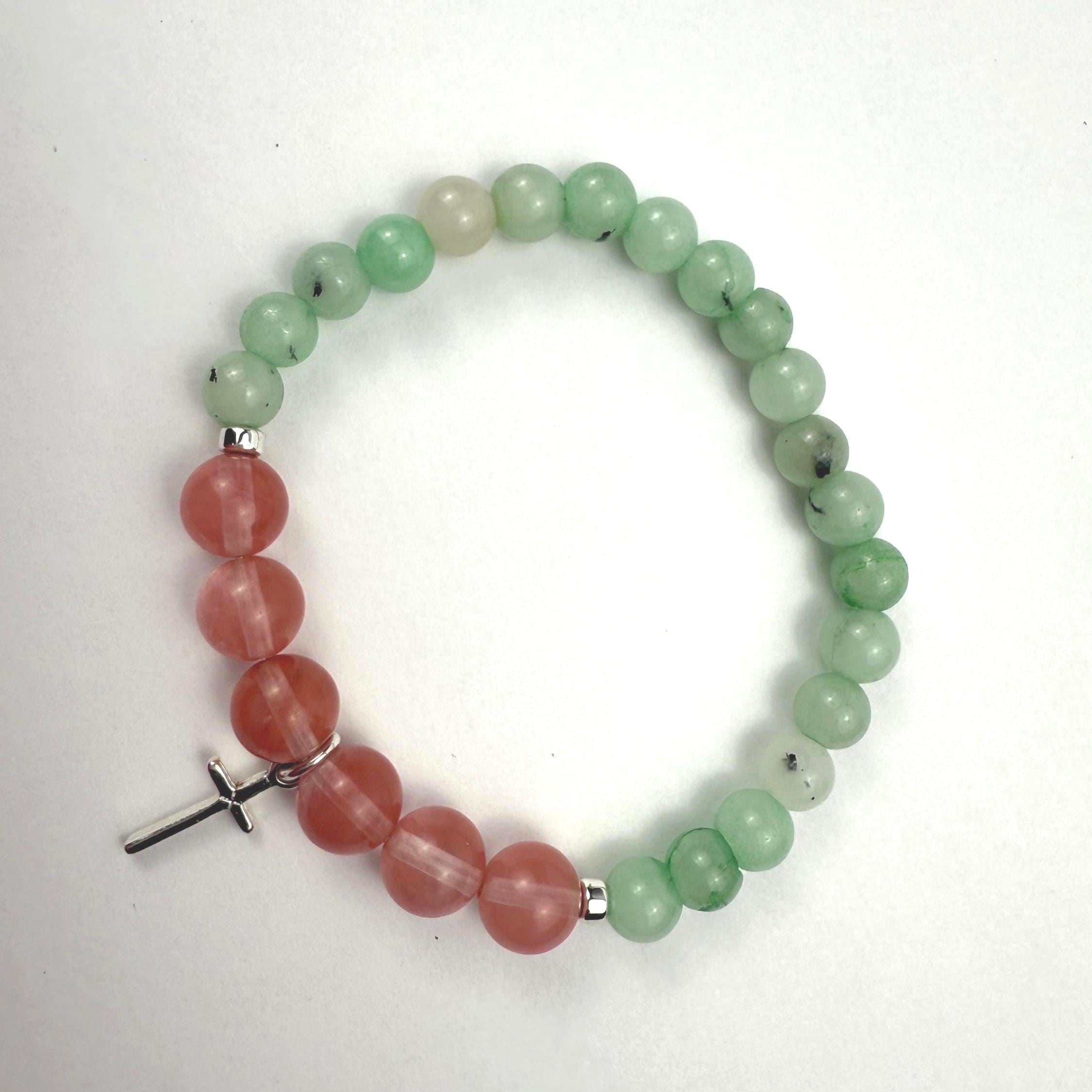 Malaysia Jade (6–7mm), Glass Quartz Cherry (8mm), Hematite, Silver-plated cross charm, Stretch cord