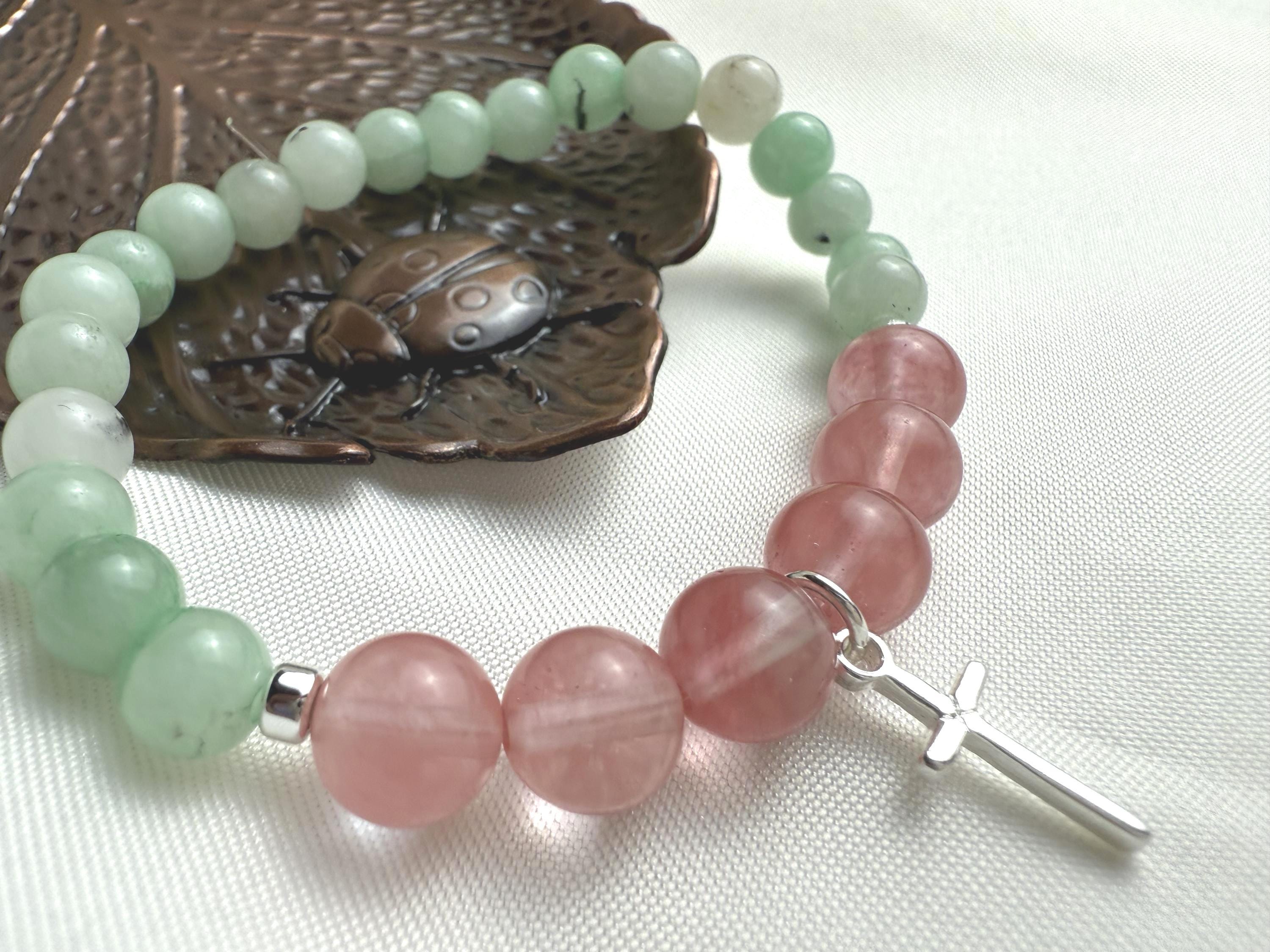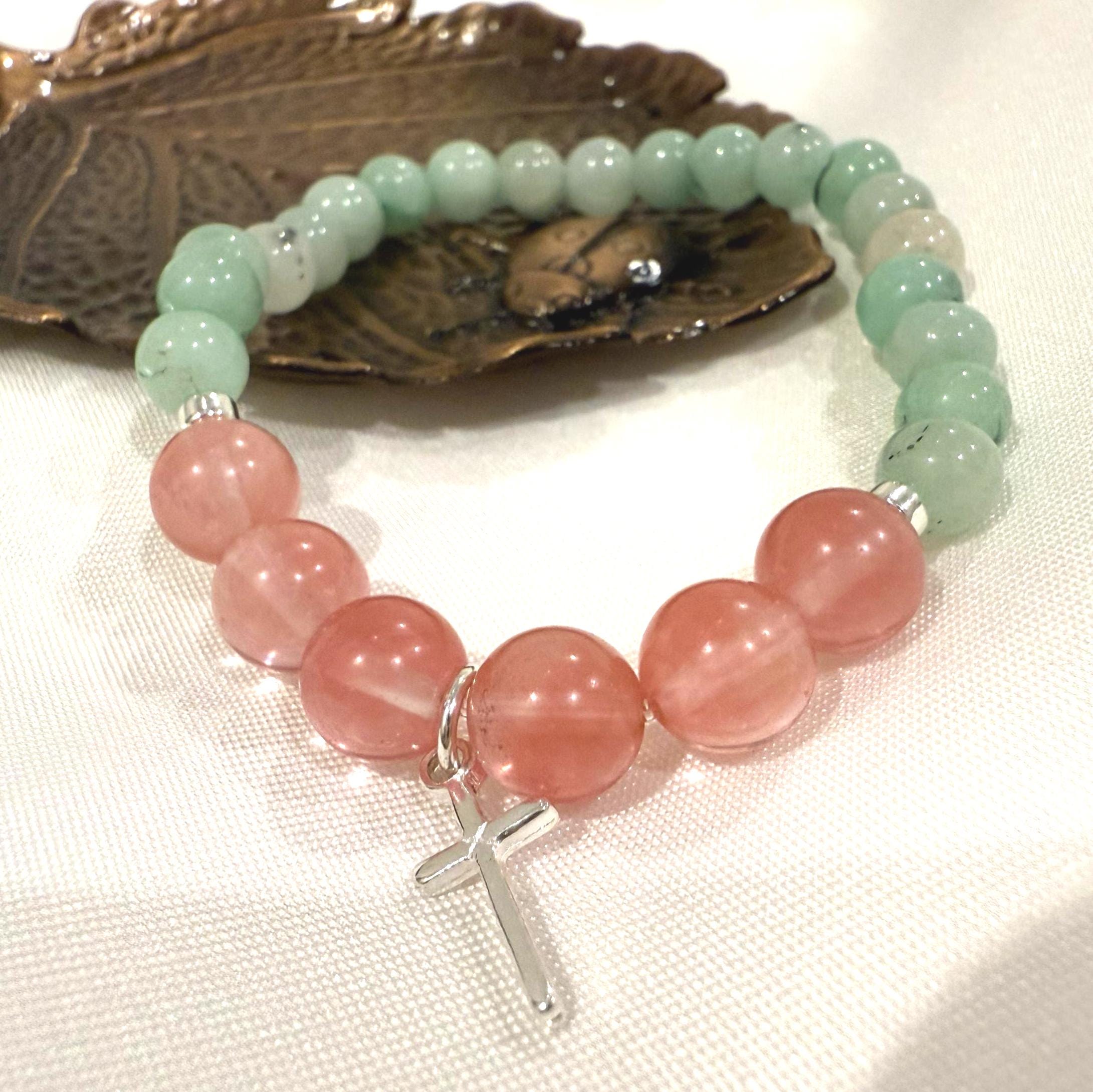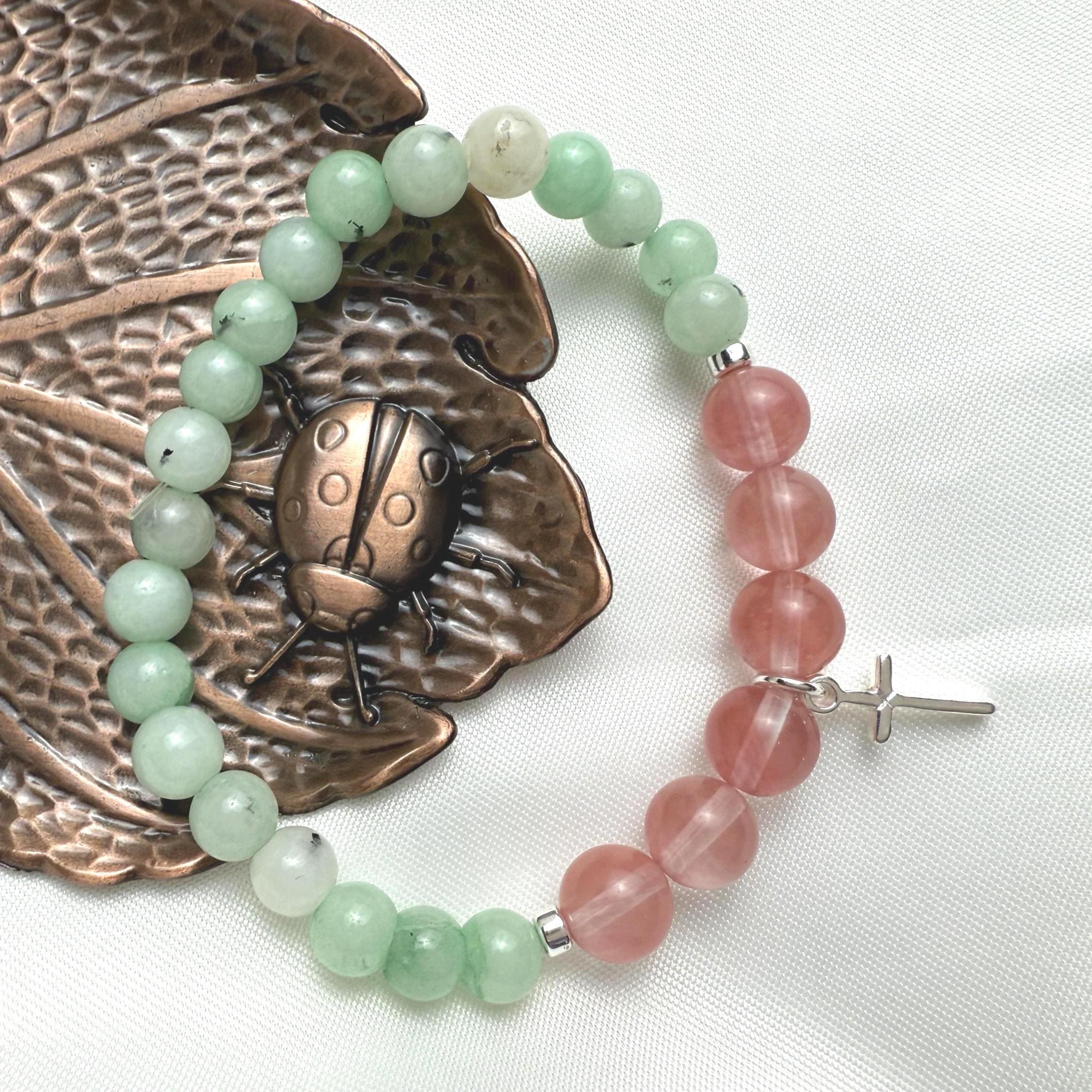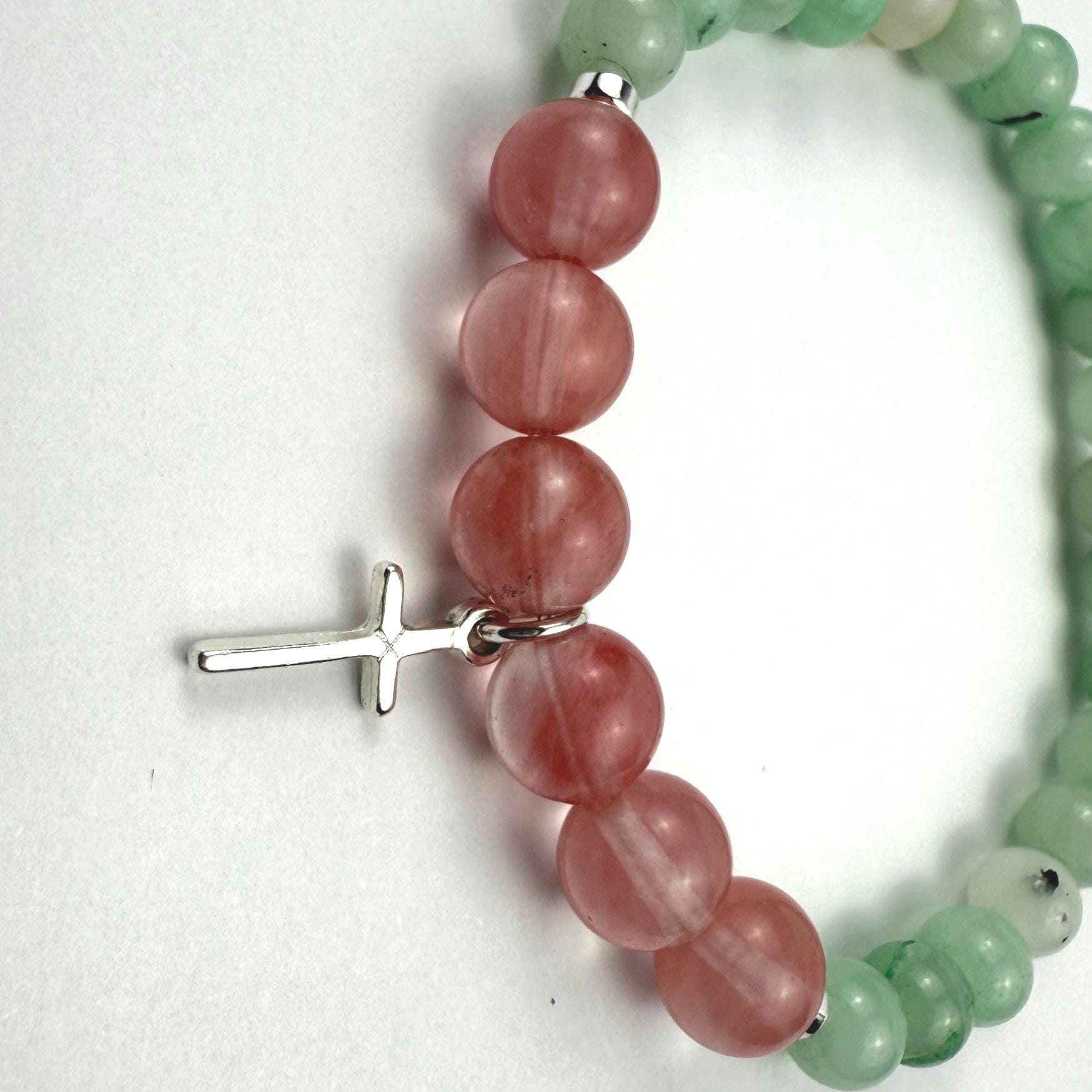 Malaysia Jade (6–7mm), Glass Quartz Cherry (8mm), Hematite, Silver-plated cross charm, Stretch cord