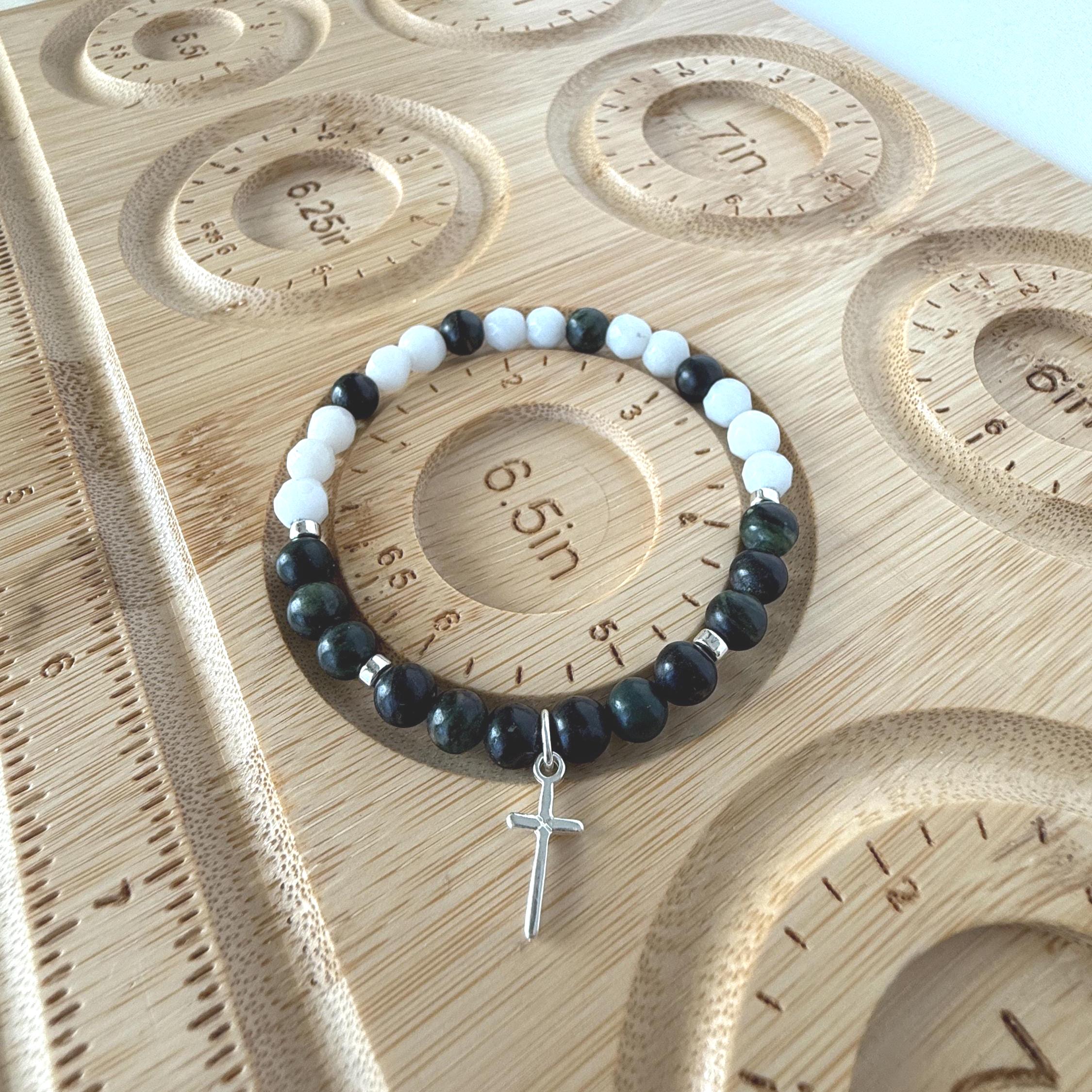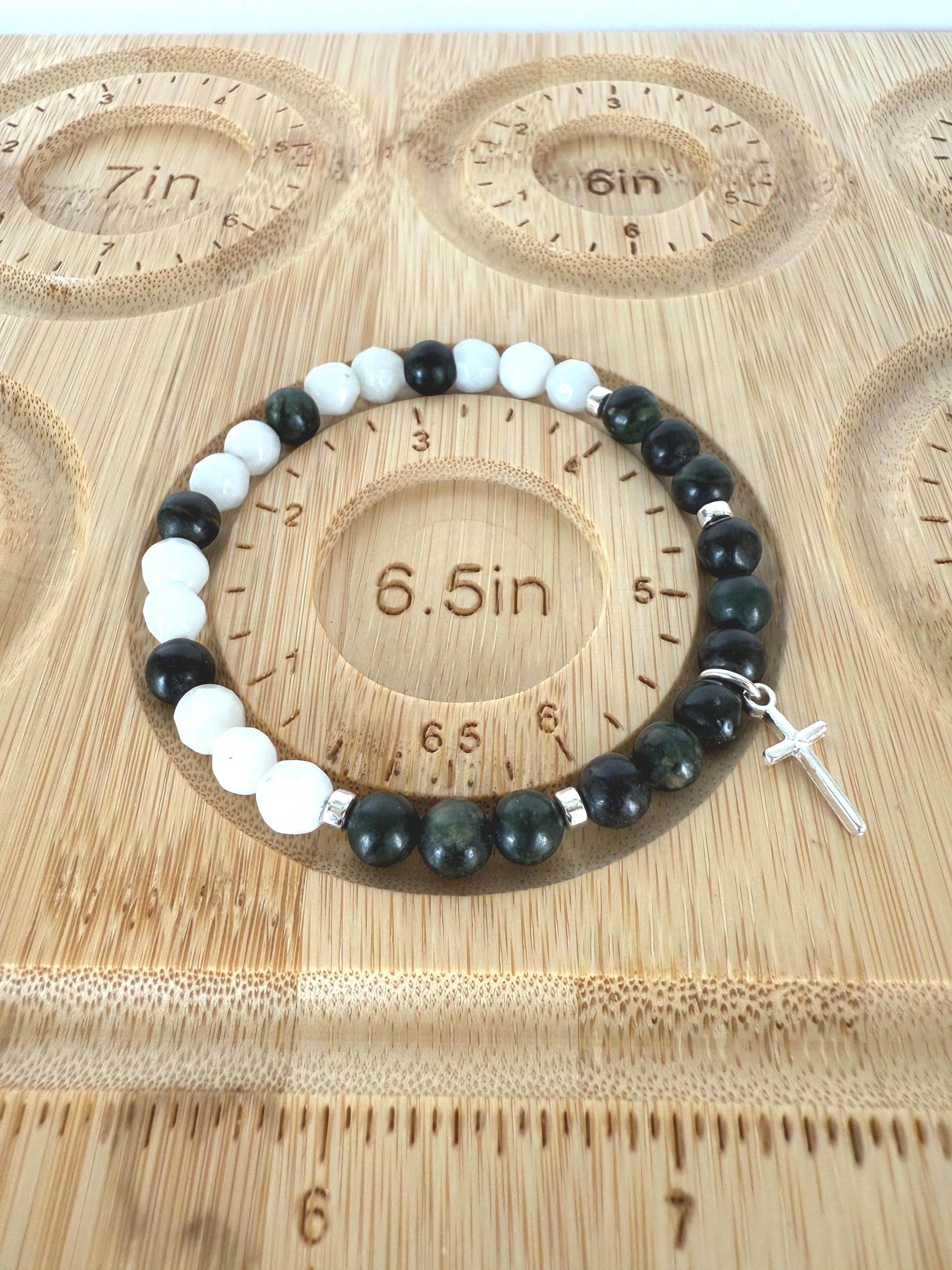 Green Serpentine & White Mountain Jade Stretch Bracelet — handcrafted bracelet featuring natural Green Serpentine and White Mountain Jade beads (6–7 mm) with silver hematite accents and a silver-plated cross charm. Lightweight, adjustable, and gift-ready, perfect for daily wear, stacking, meditation, or faith-inspired moments.