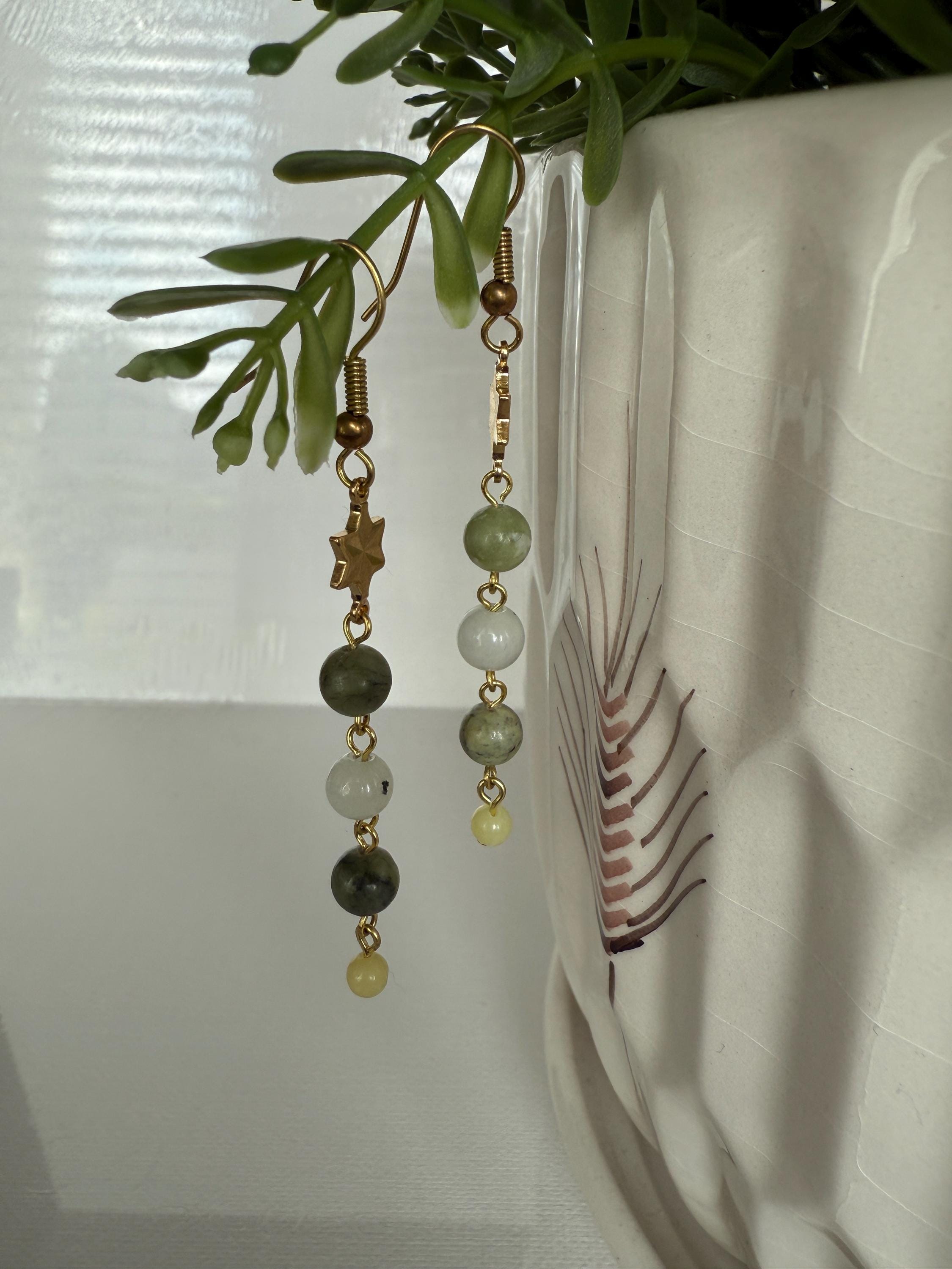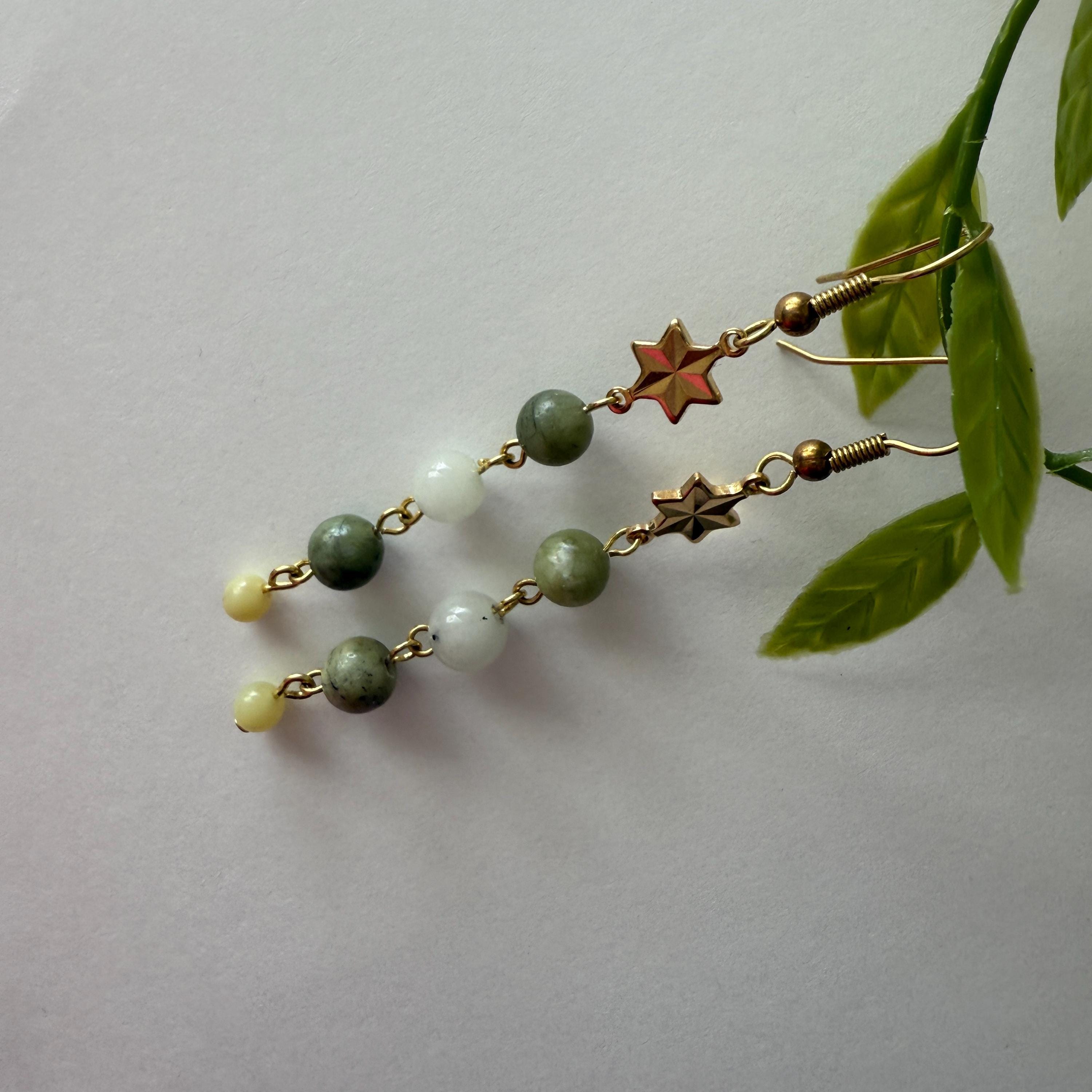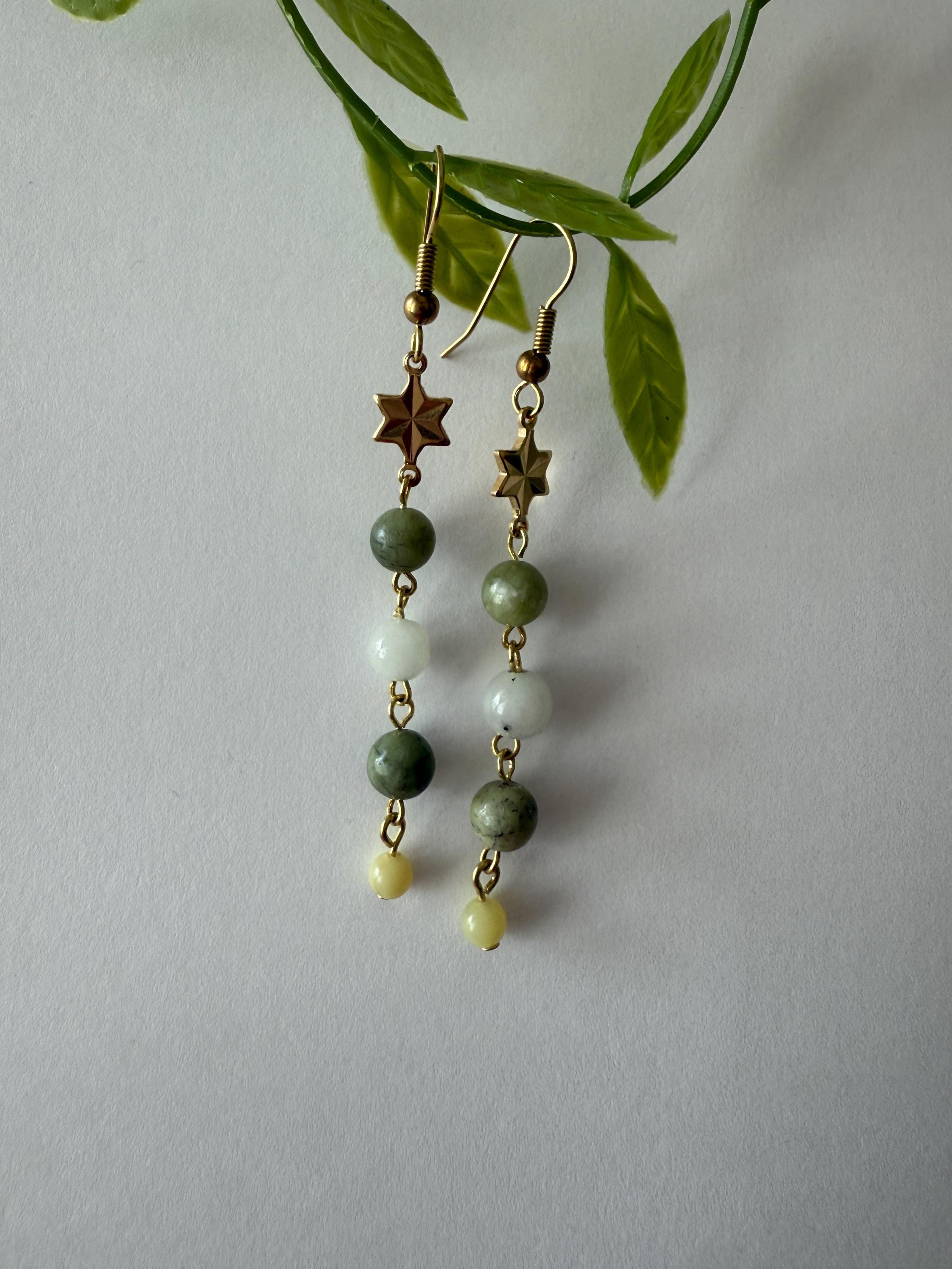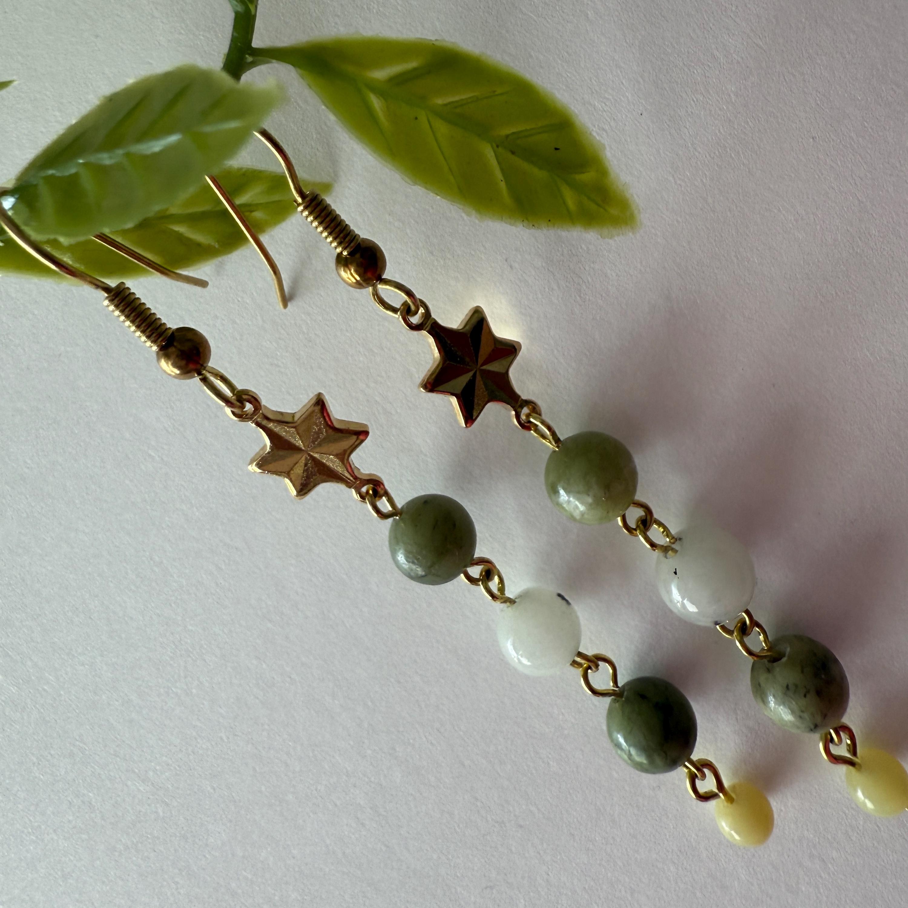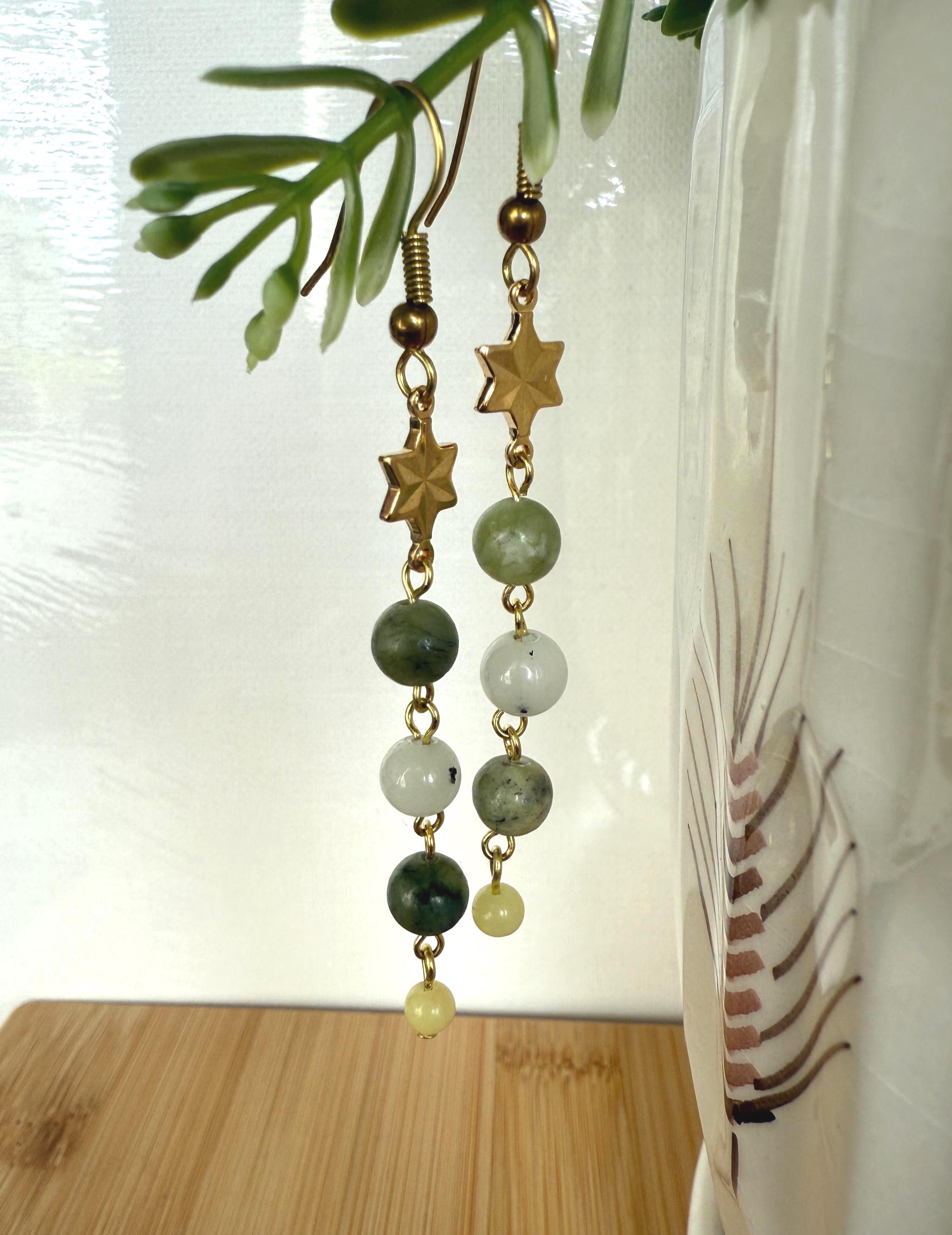 Green Gemstone Dangle Earrings with Gold Plated Star Connector — handmade dangle earrings featuring natural green gemstone beads paired with a gold plated star connector and brass hooks. Lightweight, nickel & lead free, and perfect for everyday wear or gifting.