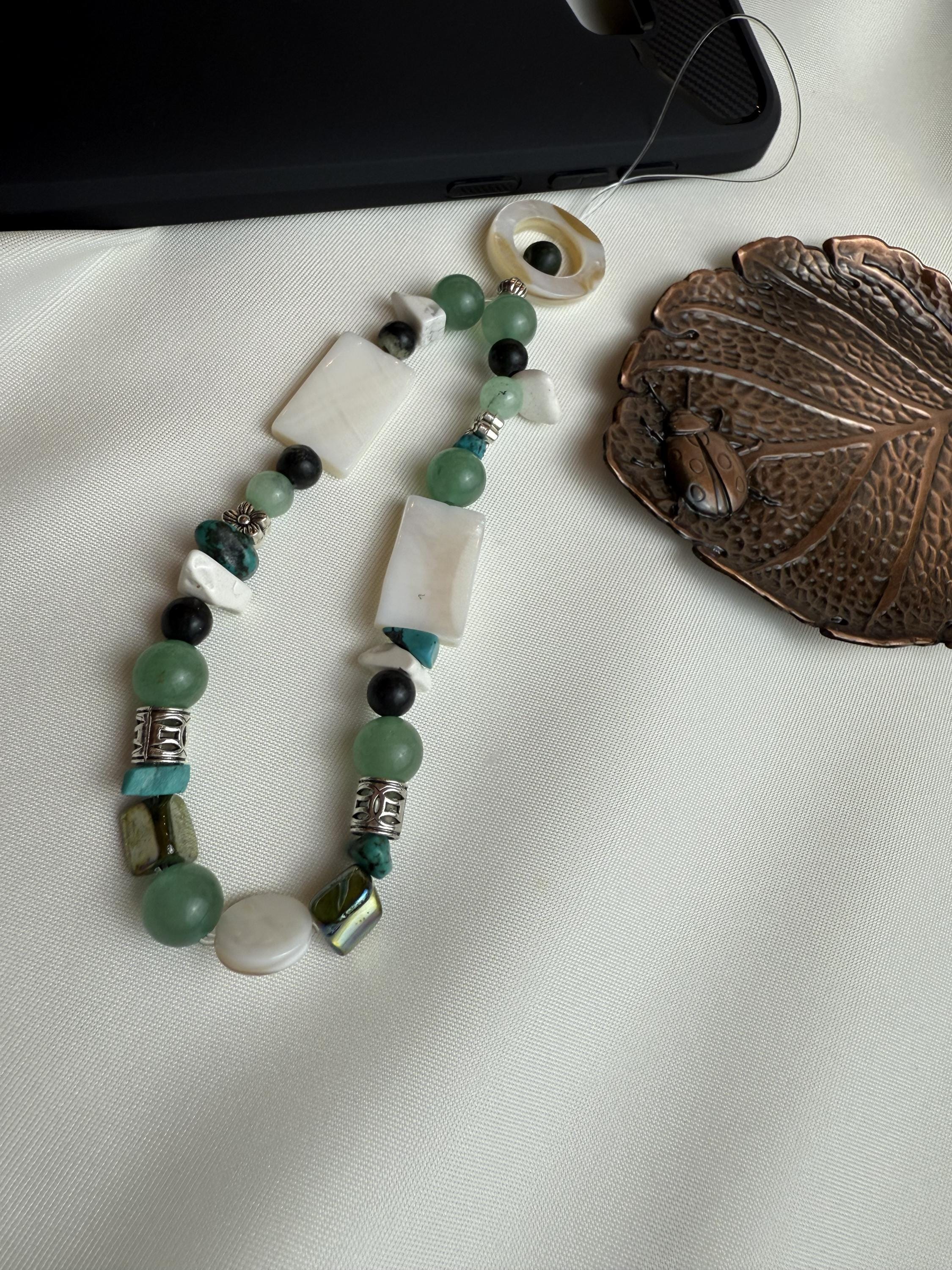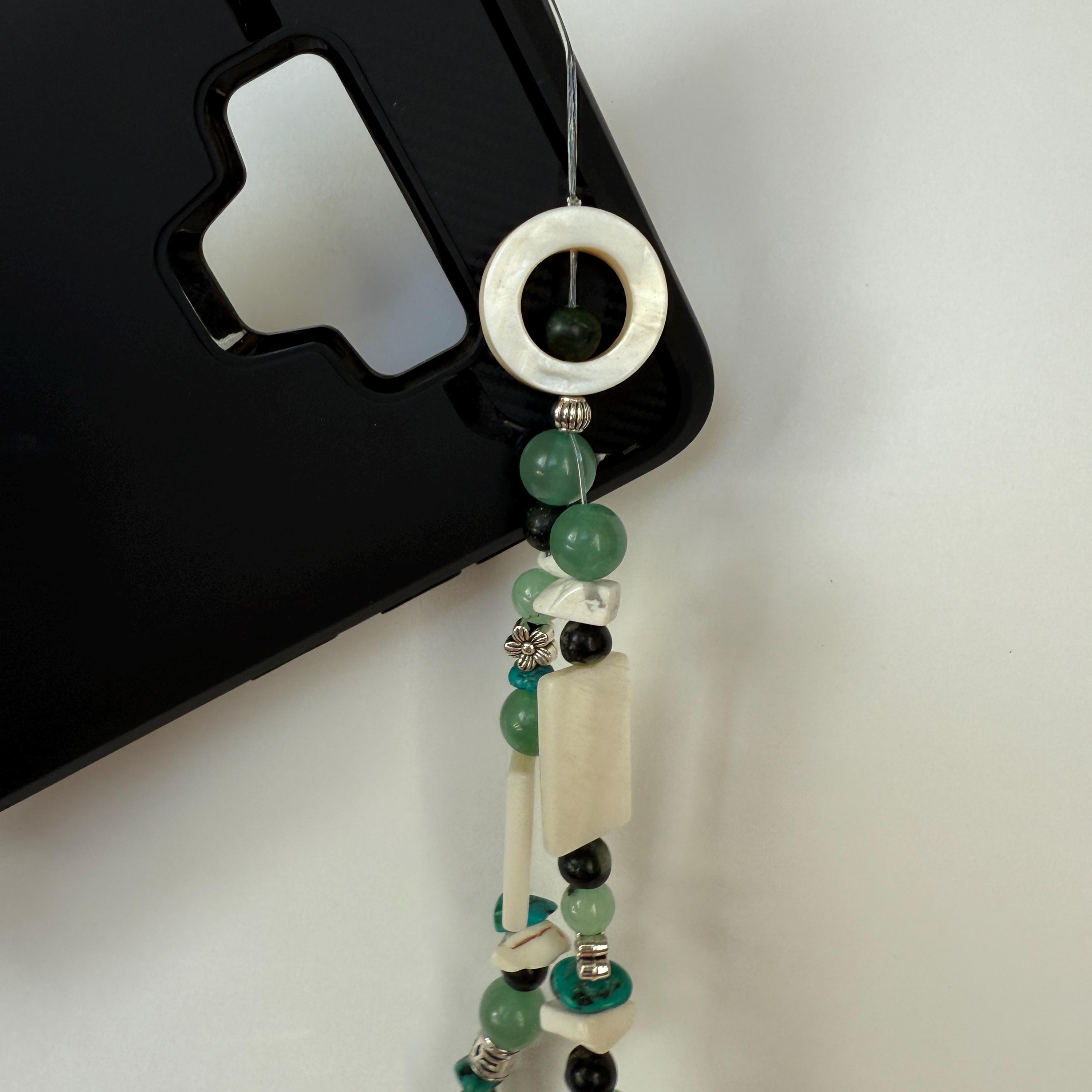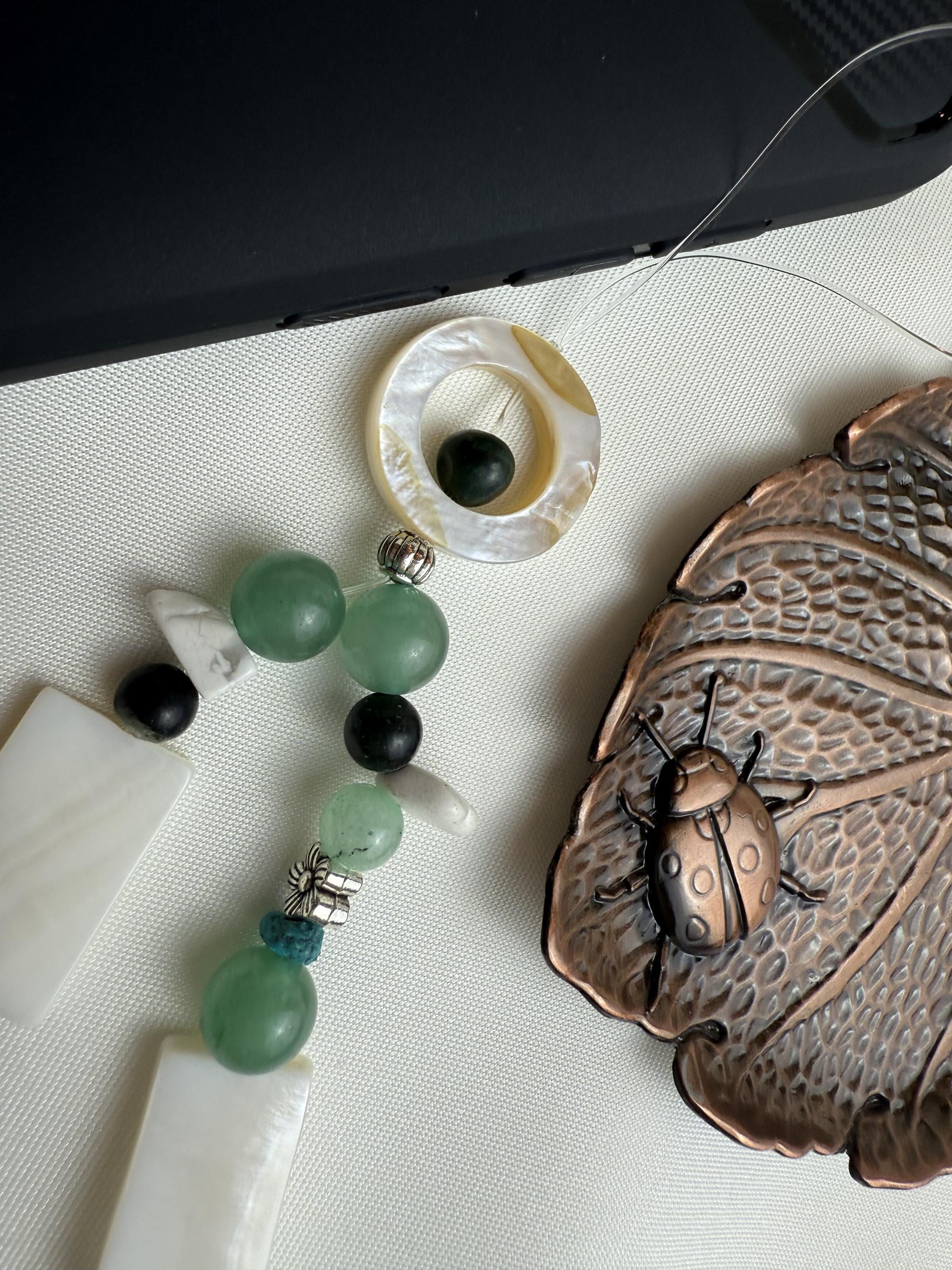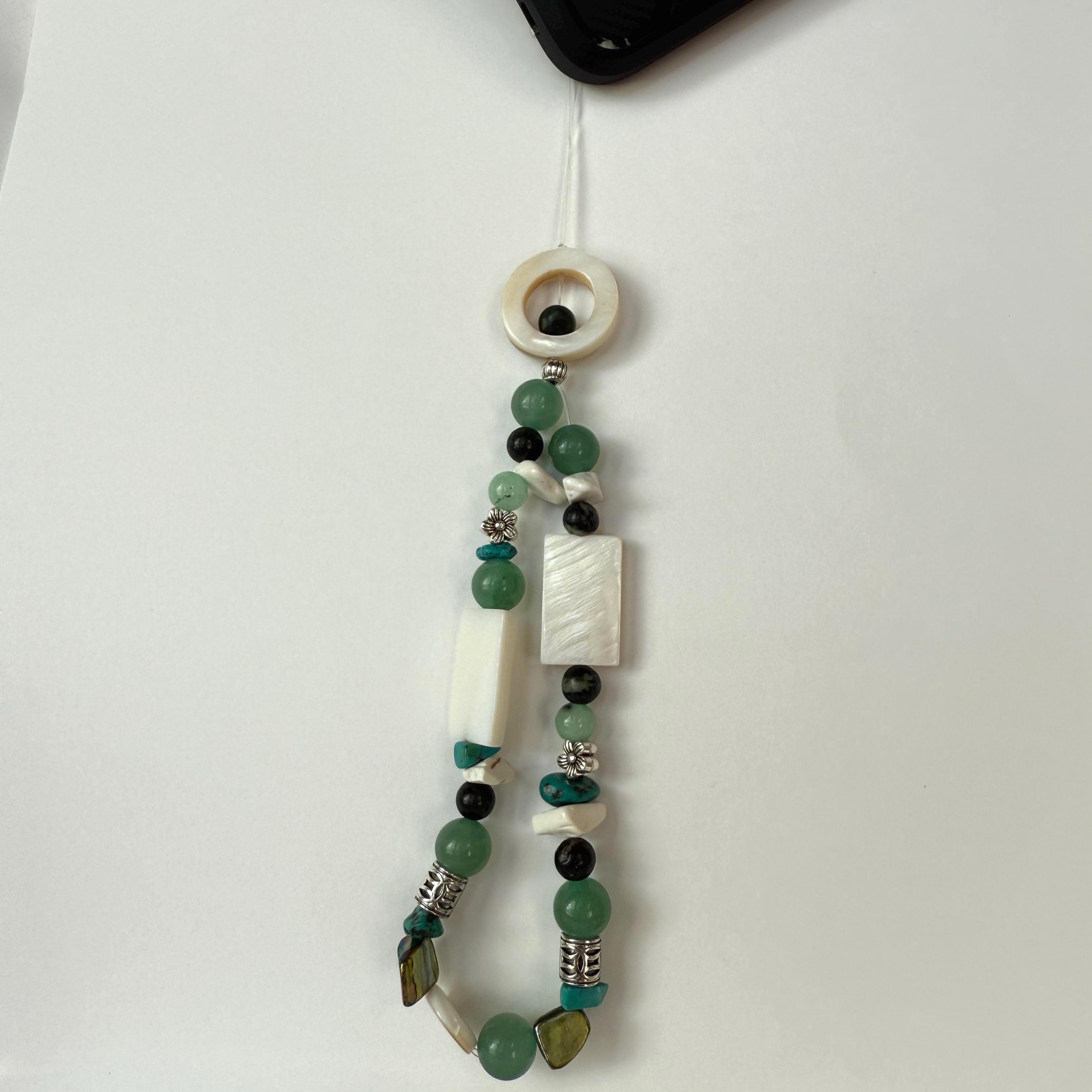 Handcrafted with care by ClovArc ☘︎, this gemstone charm features Green Aventurine, mixed gemstone chips, and luminous Mother of Pearl beads with a round donut accent bead. Polished metal spacers add shine and elegance. Lightweight and durable, it works beautifully as a phone charm, bag charm, or keychain accessory. Gift-ready and proudly handmade in the USA.