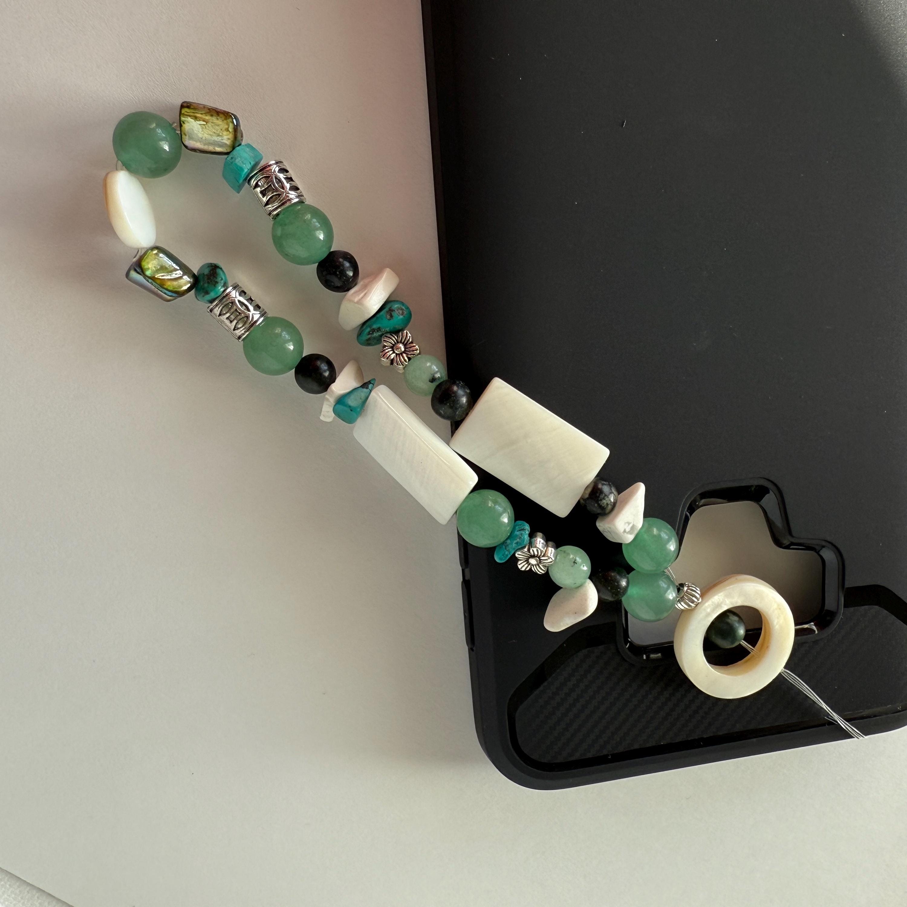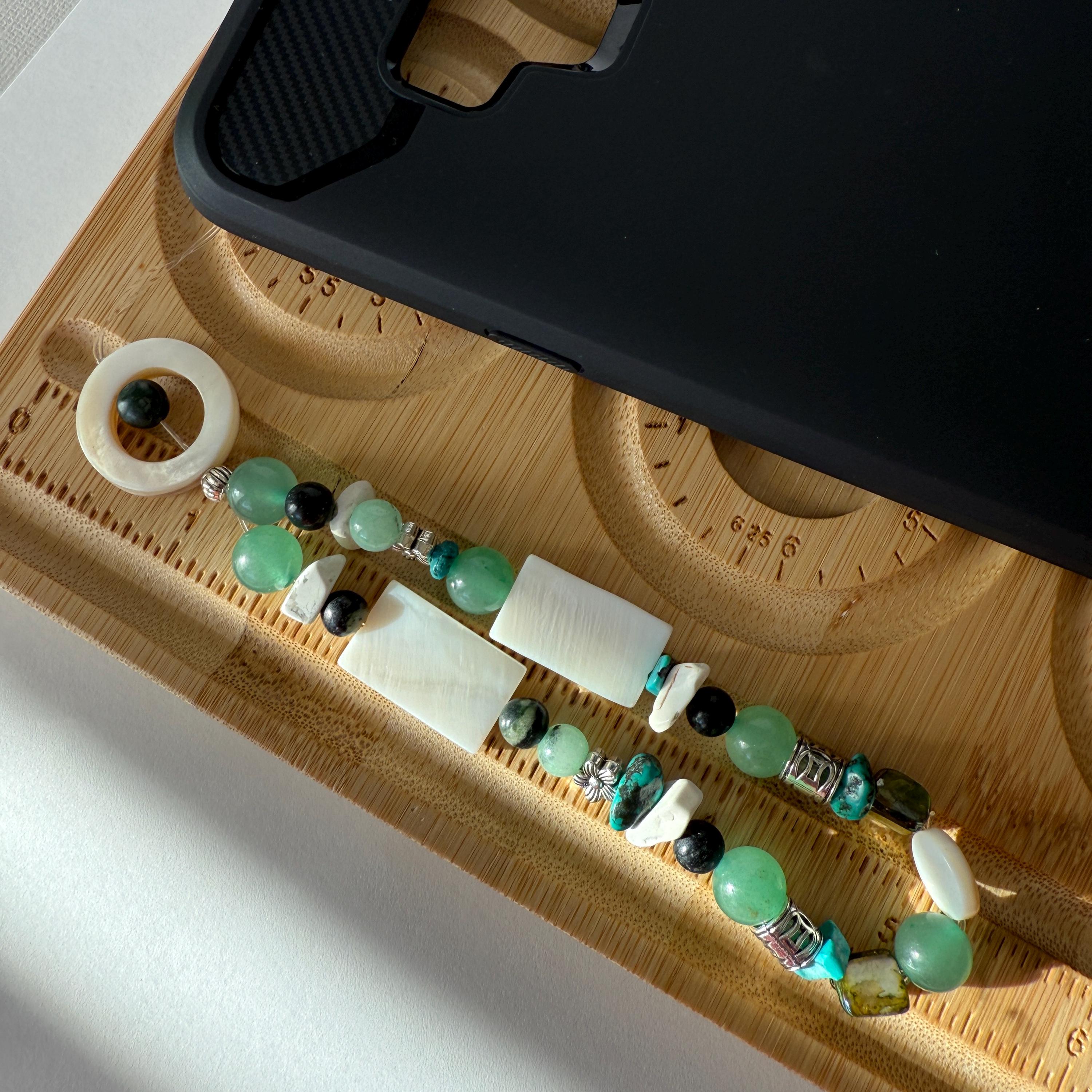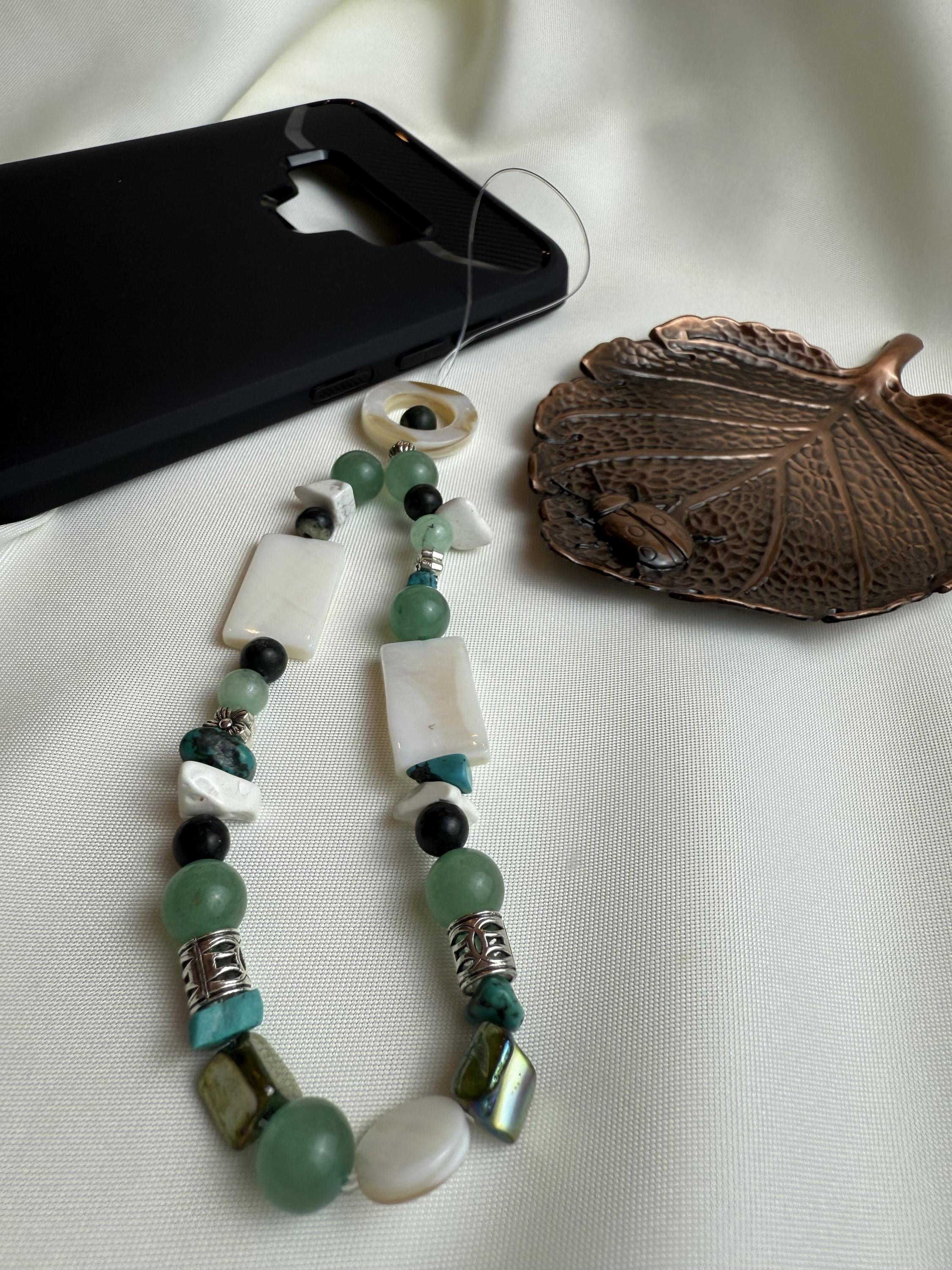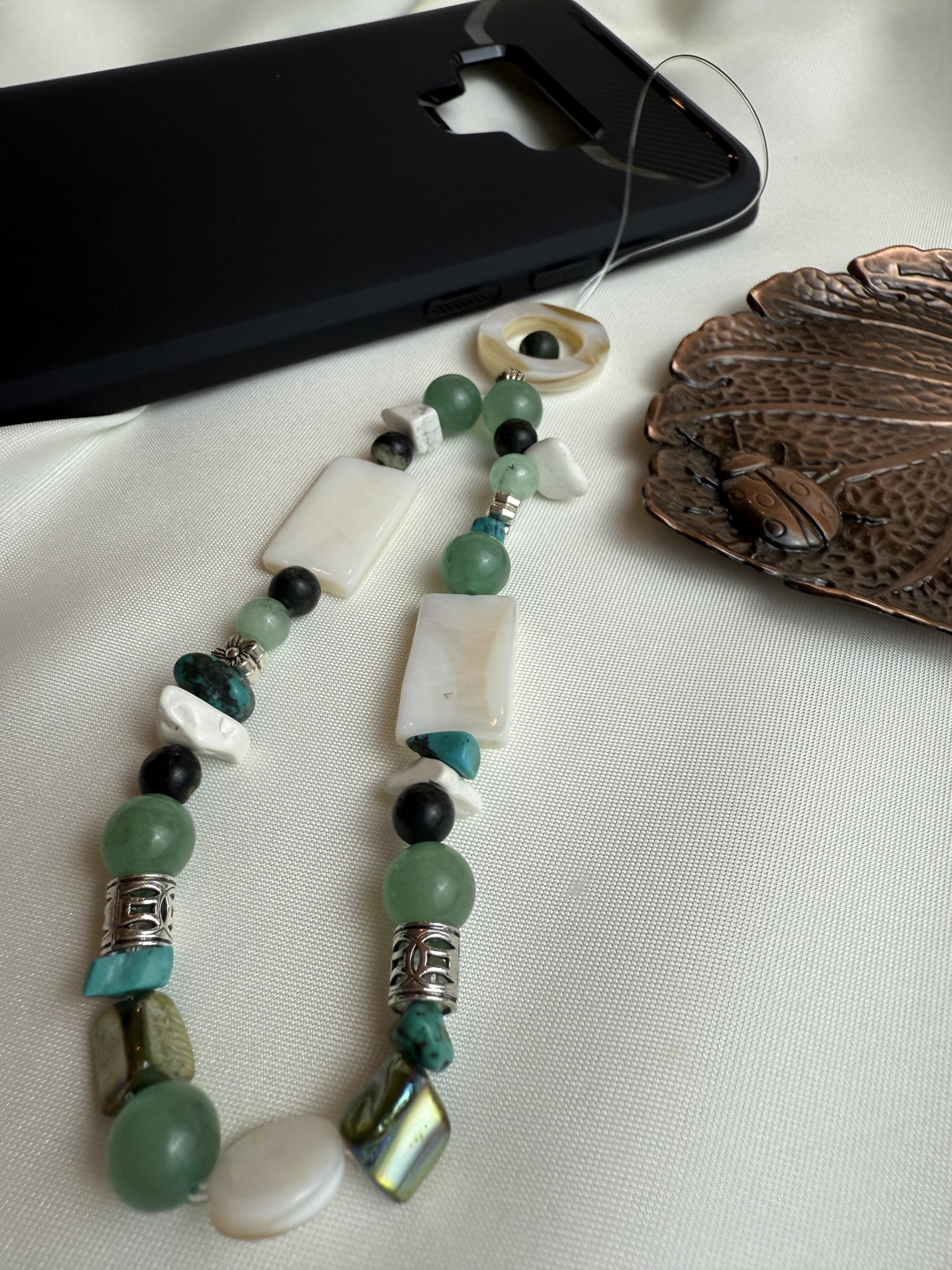 Handcrafted with care by ClovArc ☘︎, this gemstone charm features Green Aventurine, mixed gemstone chips, and luminous Mother of Pearl beads with a round donut accent bead. Polished metal spacers add shine and elegance. Lightweight and durable, it works beautifully as a phone charm, bag charm, or keychain accessory. Gift-ready and proudly handmade in the USA.