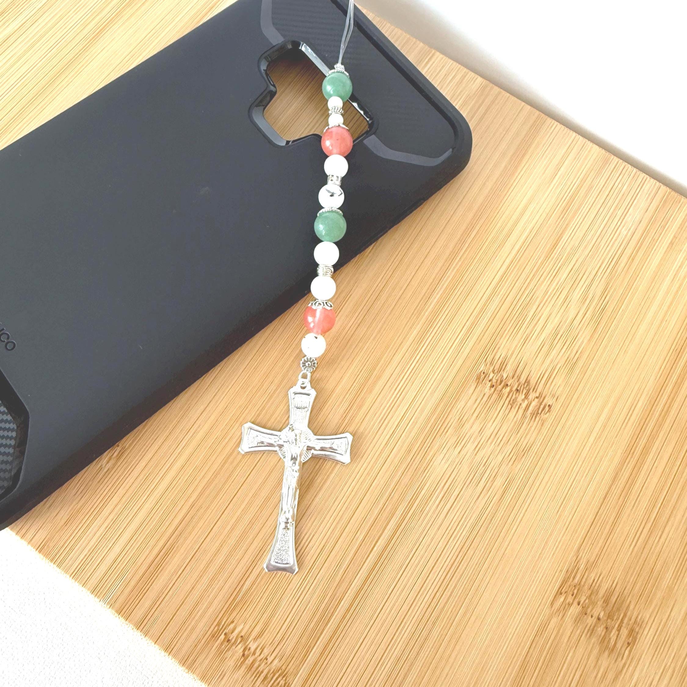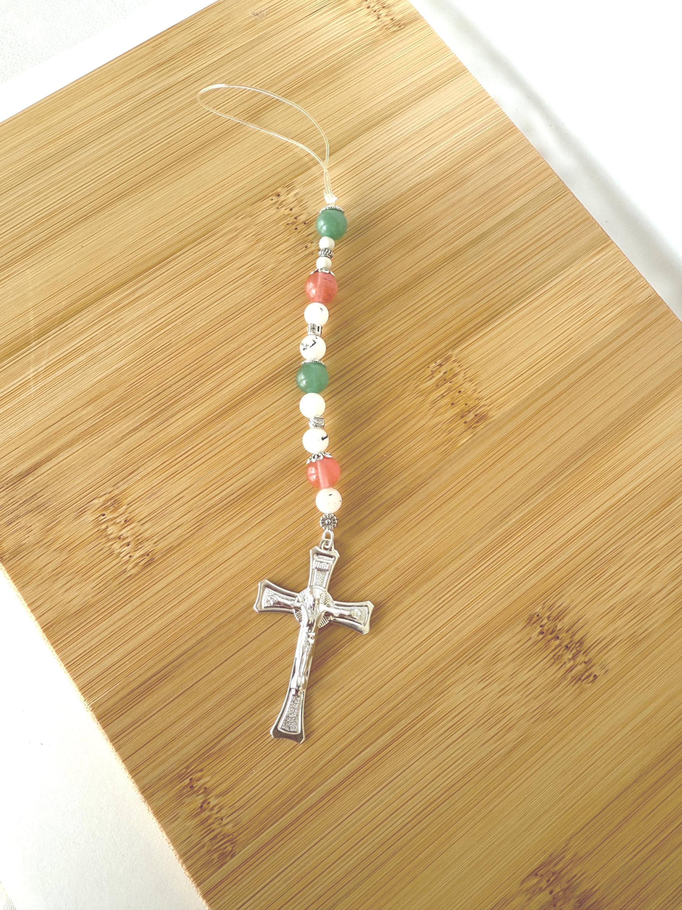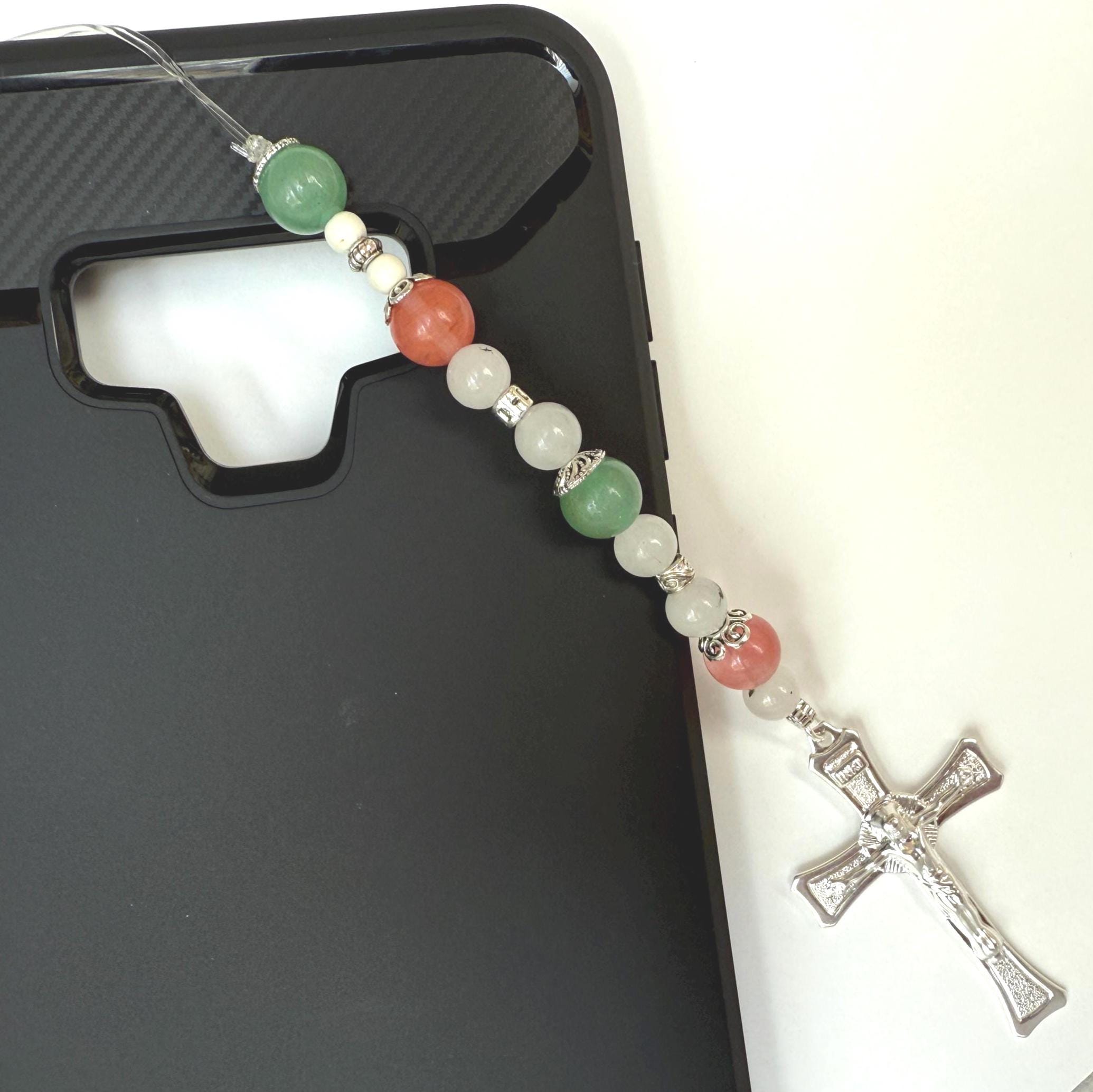 Elevate your phone, bag, or keychain with this unique handmade charm featuring natural gemstones and a silver-plated cross.