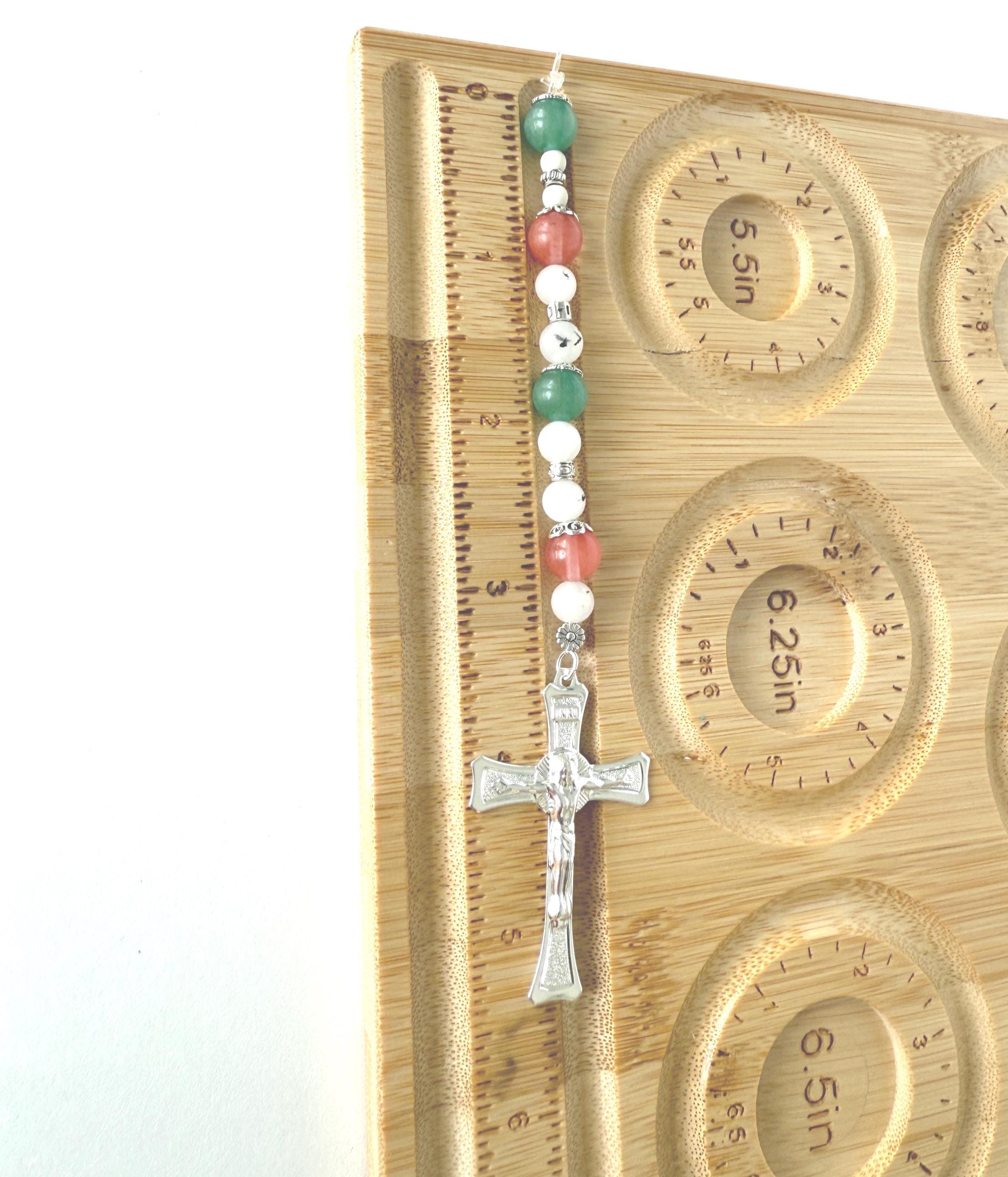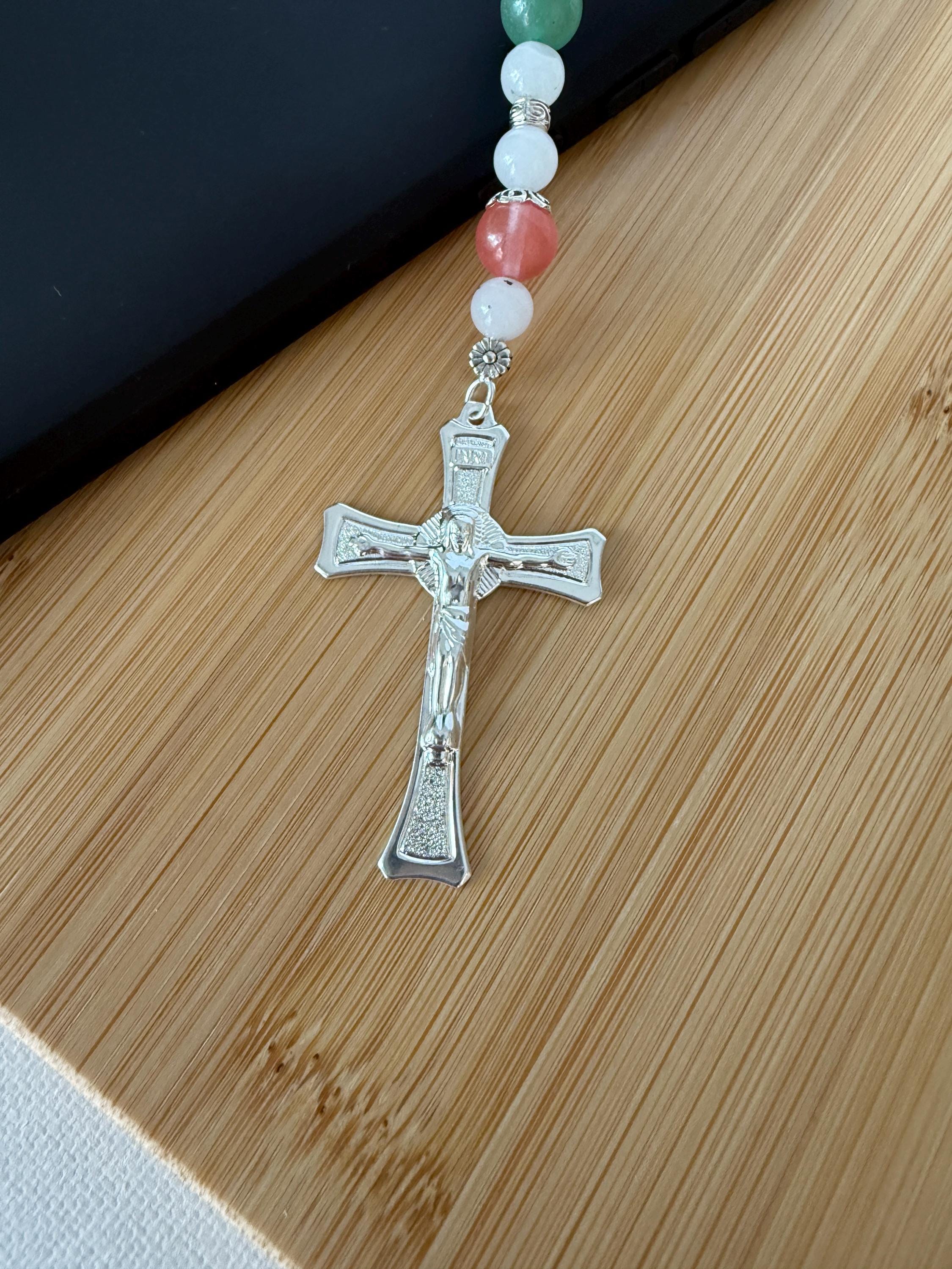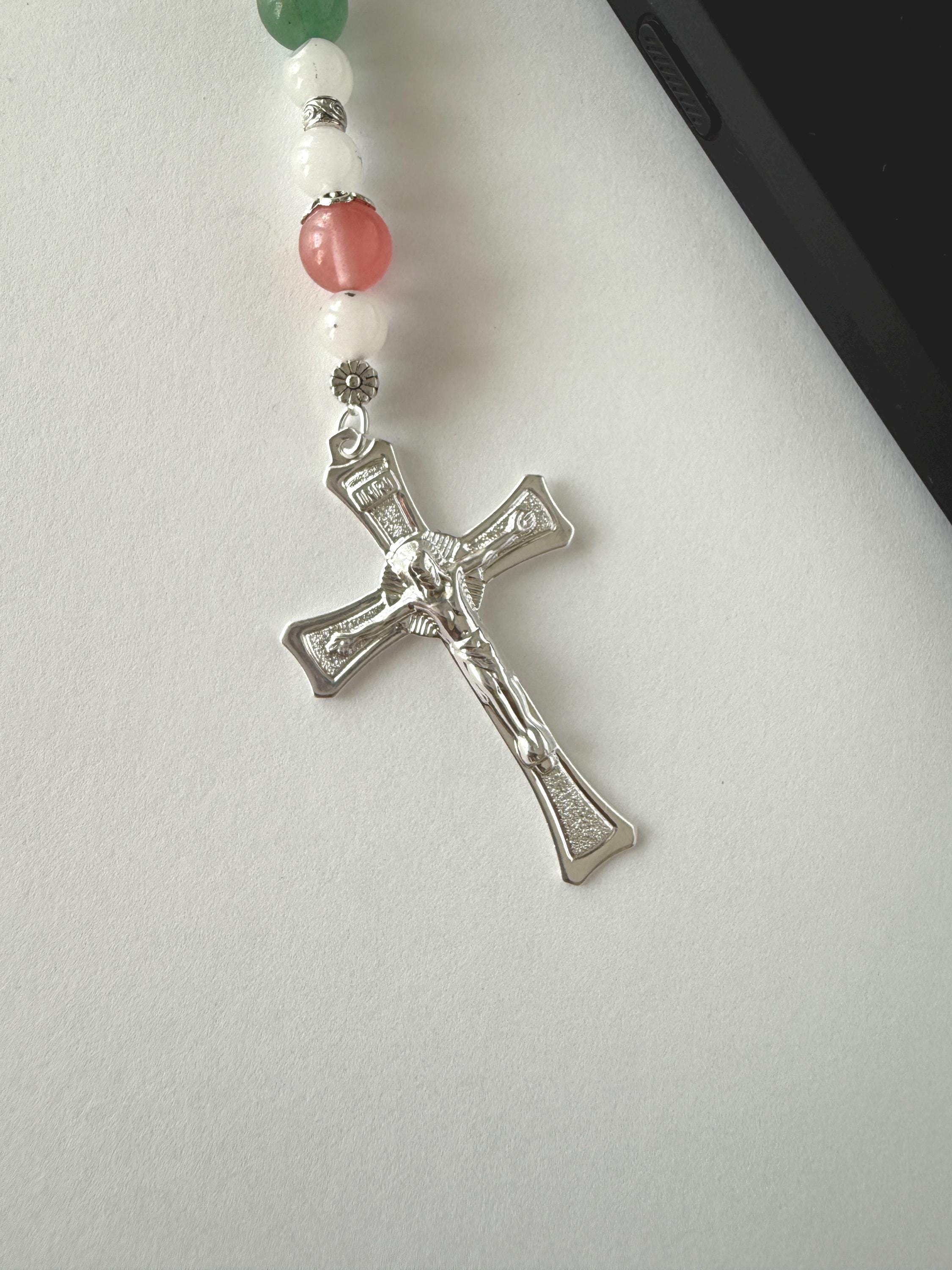 Elevate your phone, bag, or keychain with this unique handmade charm featuring natural gemstones and a silver-plated cross.