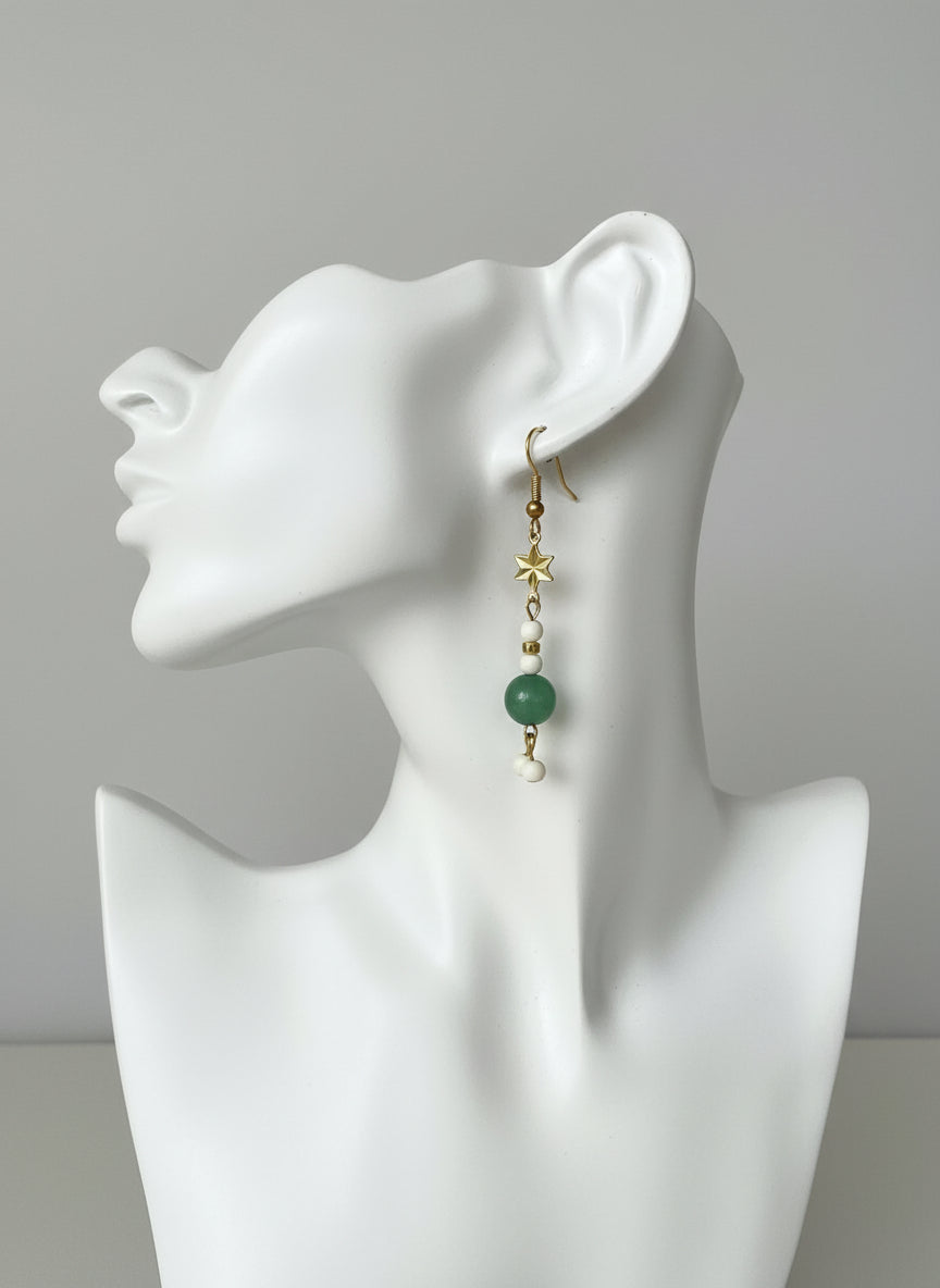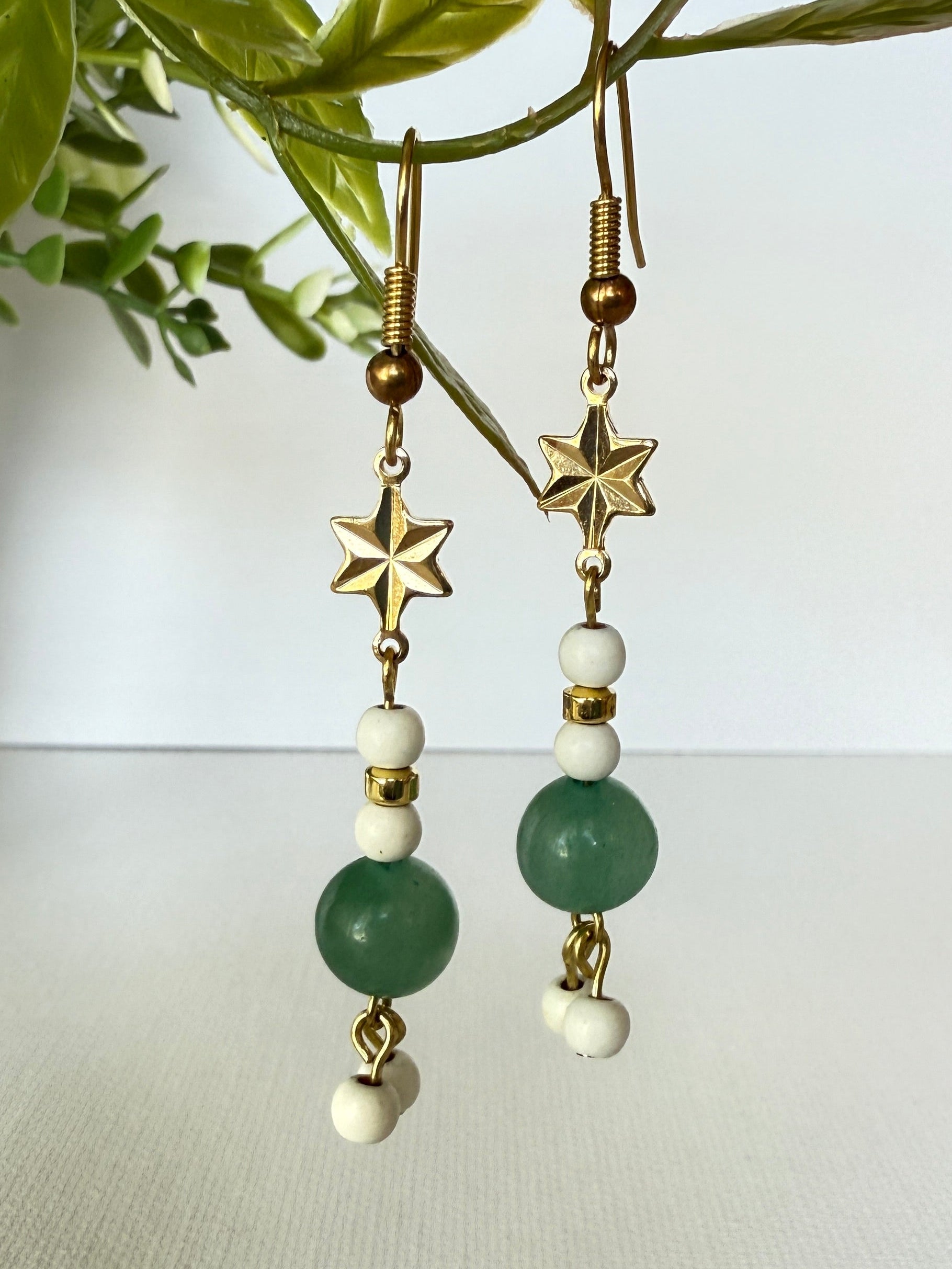 Handmade dangle earrings featuring natural green aventurine and white magnesite beads with a gold plated star connector and brass hooks. Nickel and lead free — elegant and lightweight for everyday wear.