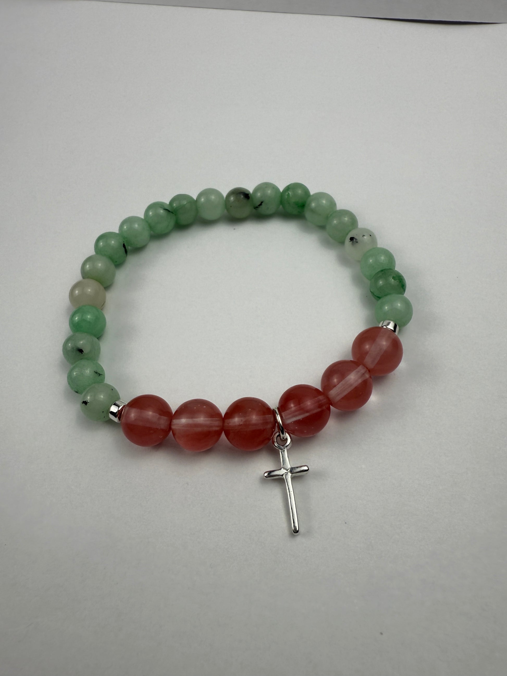 This Handmade Malaysia Jade & Cherry Quartz Bracelet features beautiful natural gemstone beads with an elegant silver cross charm. A meaningful piece that combines faith and style.