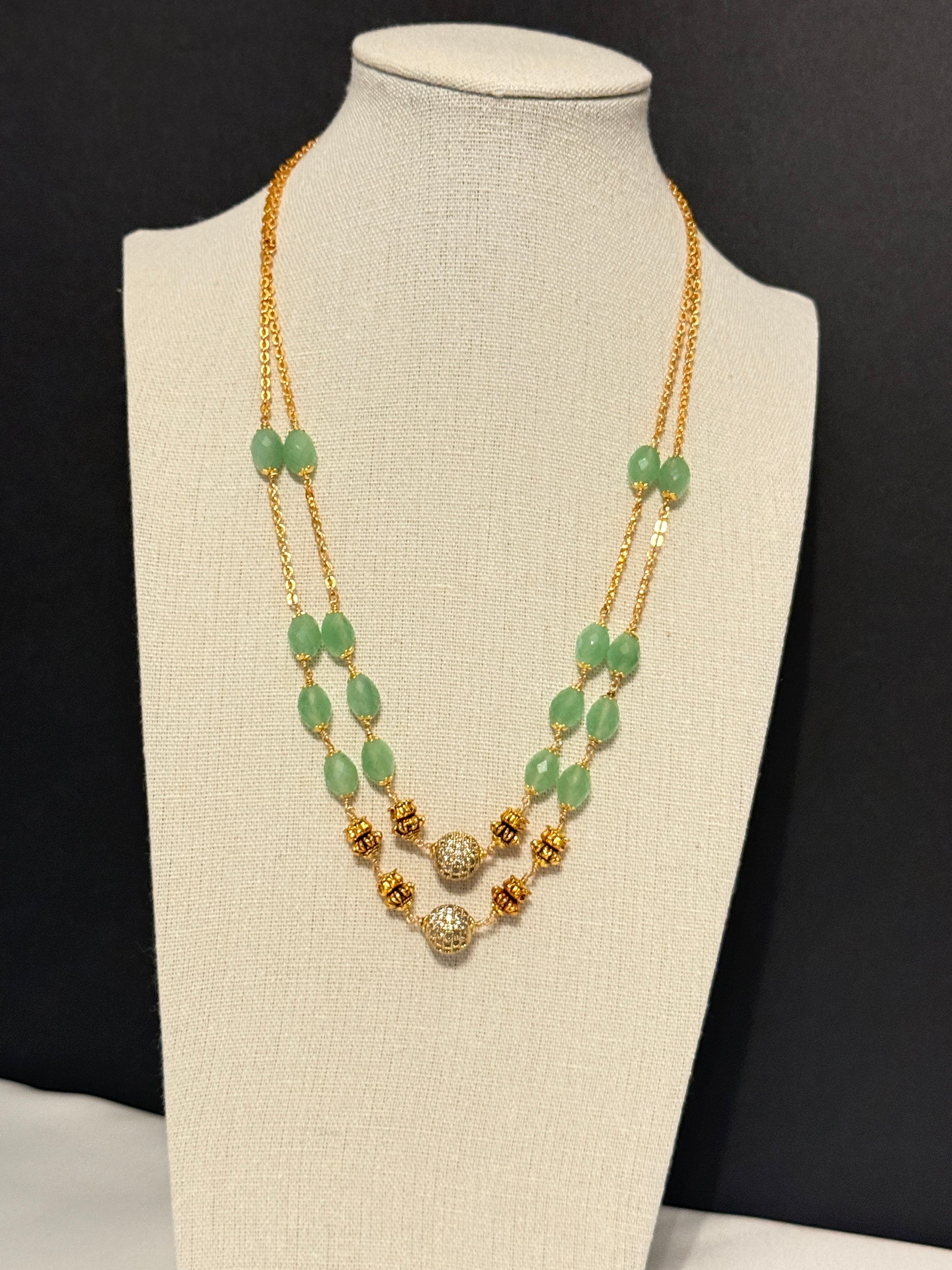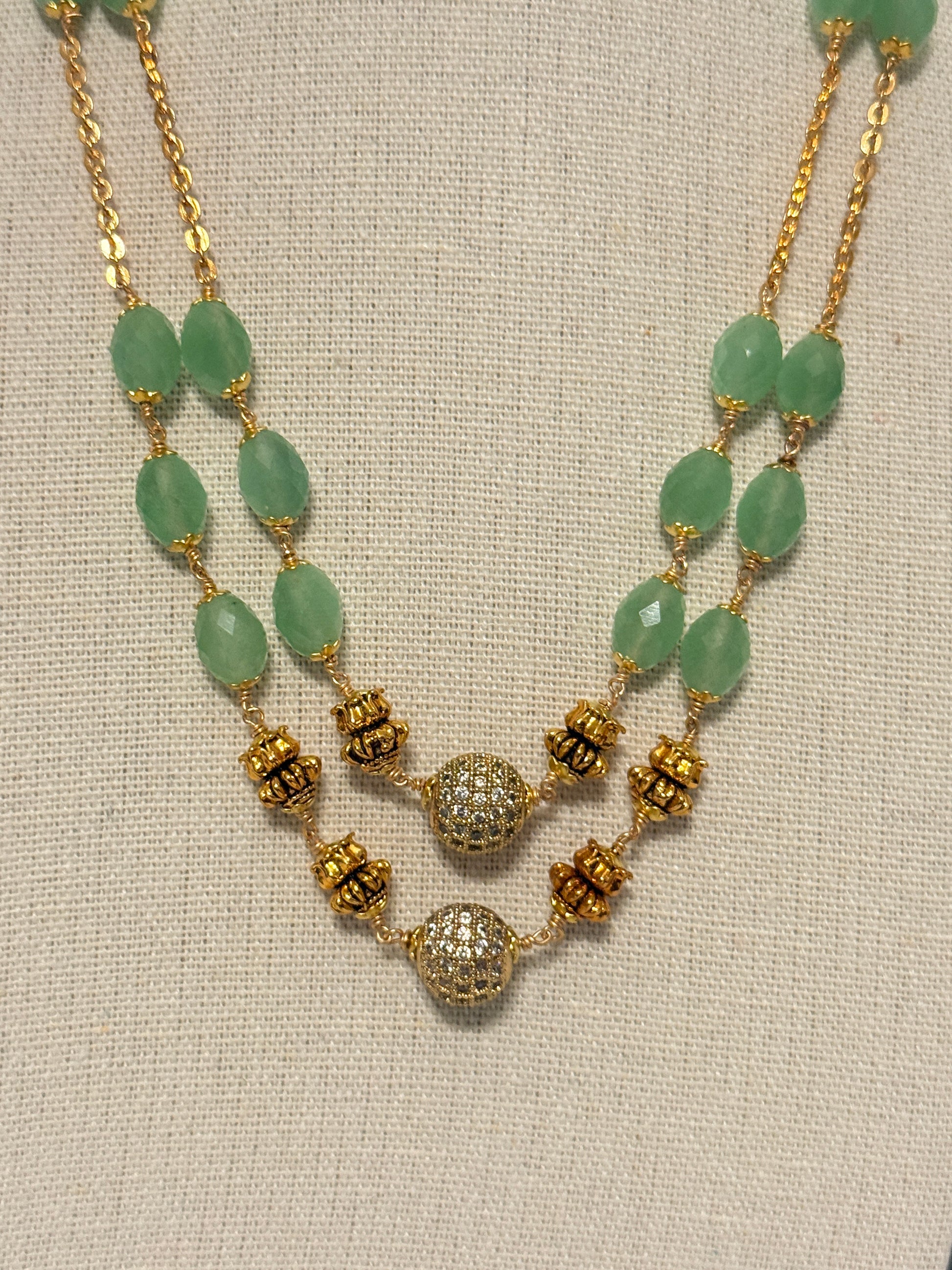 Elegant double-strand necklace with delicate sage green beads and ornate gold filigree accents on fine gold chains. Perfect for adding a refined touch to any outfit.